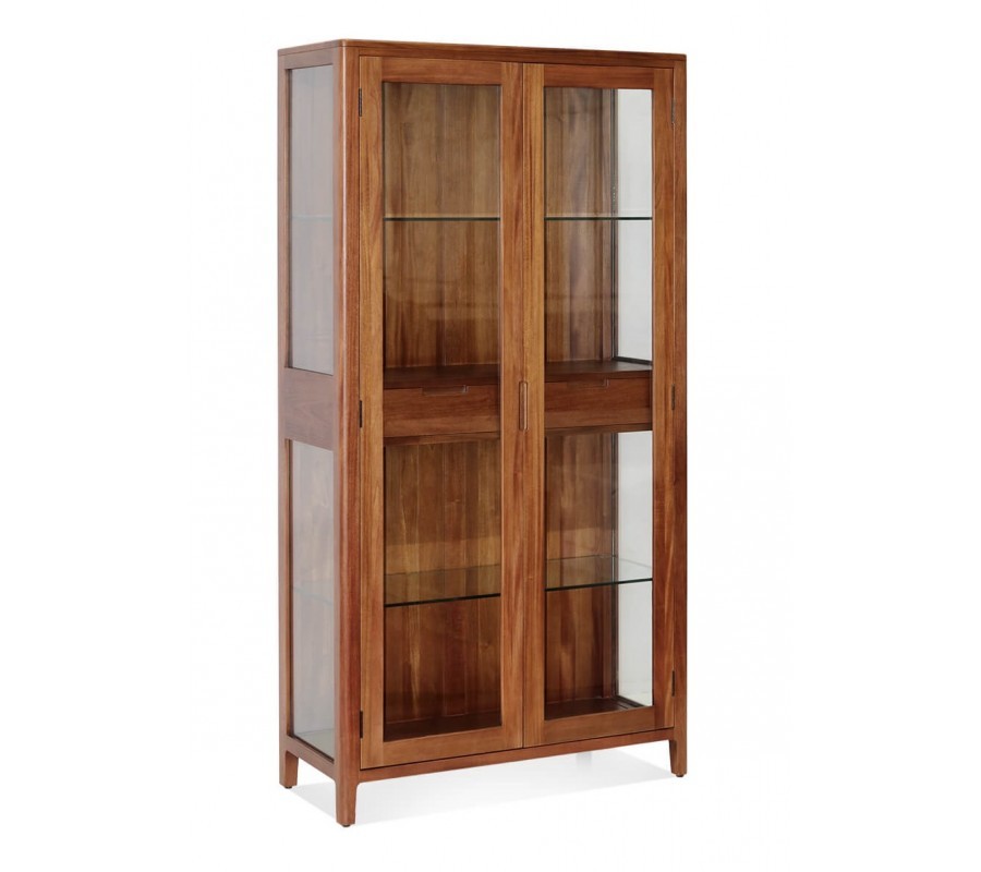 Nábytek je vyroben z masivního mahagonového dřeva. Povrchová úprava v tmavě hnědé barvě s charakteristickými načervenalými odstíny dodává sestavě luxusní koloniální charakter. Kromě atraktivního vizuálu je tento materiál ceněn i pro svoji vysokou pevnost a odolnost. V designu dominují rovné linie a hladké povrchy, které působí moderním minimalistickým dojmem a vyzdvihují do popředí krásu mahagonu. Jemné zaoblení rohů siluety zjemňují a dodávají sestavě eleganci.