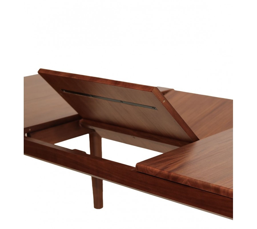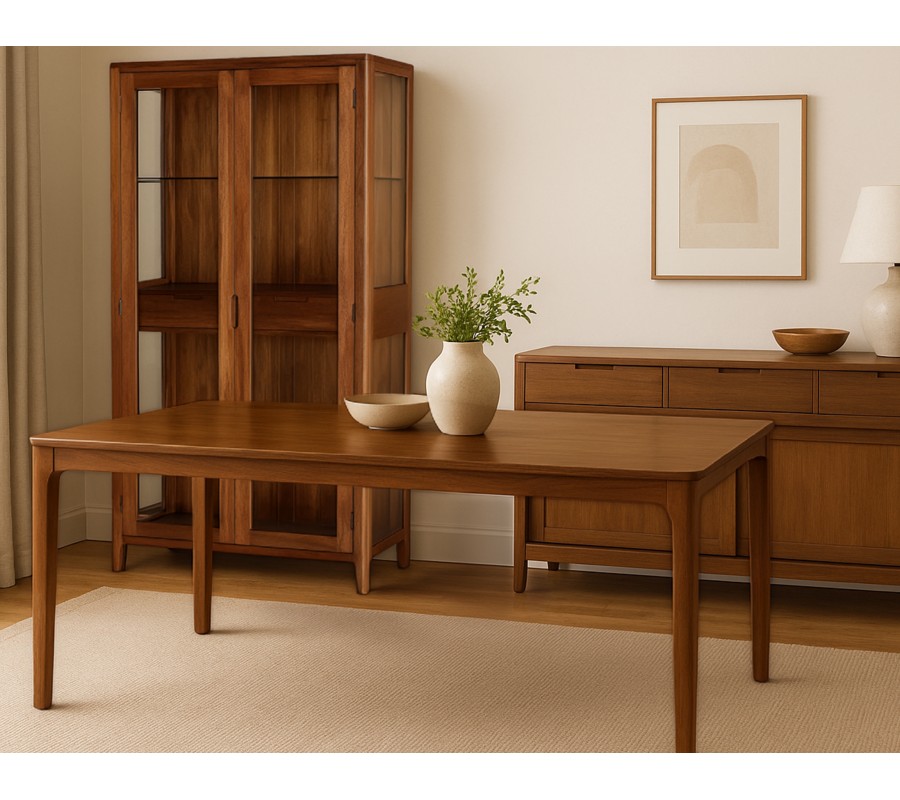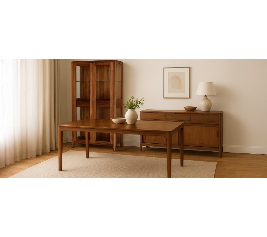V centru sestavy se nachází obdélníkový jídelní stůl s rozkládací funkcí a maximální délkou 240 cm, který poskytne stolovací místo pro až deset osob. Doplňují jej praktické úložné prostory. Dvoudveřová vitrína s prosklenými dvířky, čtyřmi policovými místy a dvěma zásuvkami je ideální pro vystavení keramiky, porcelánu či křišťálu. Příborník s dvojitými posuvnými dvířky a třemi zásuvkami zase uskladní nádobí či textilie. Prostor můžete doplnit i dalším nábytkem ze stejné kolekce Liberia.