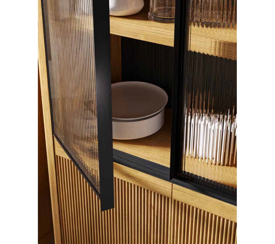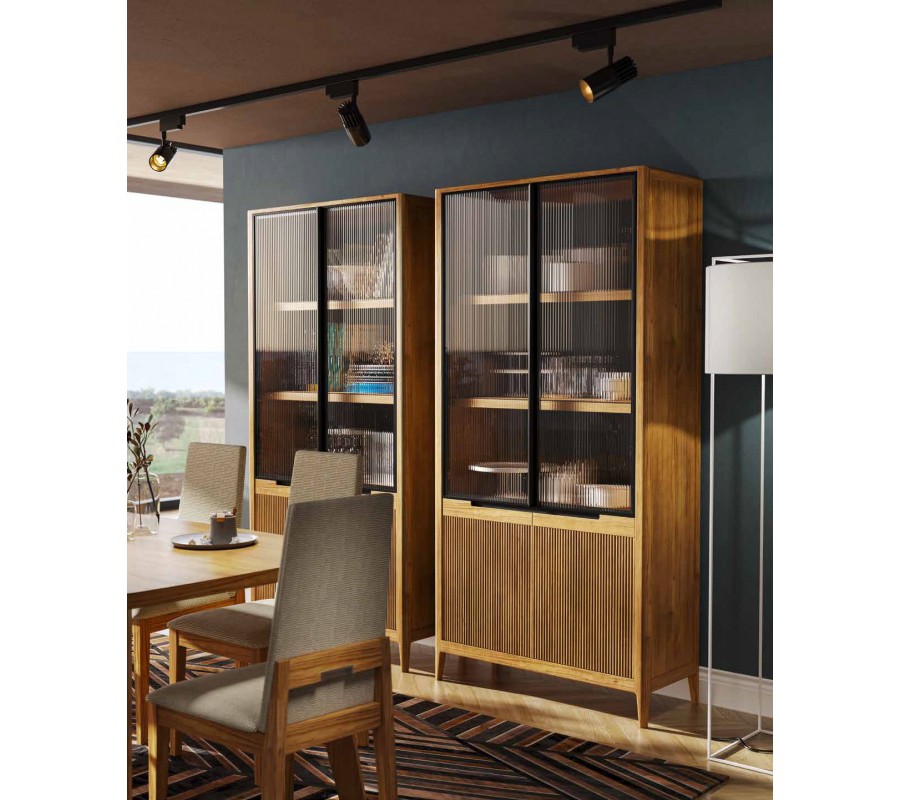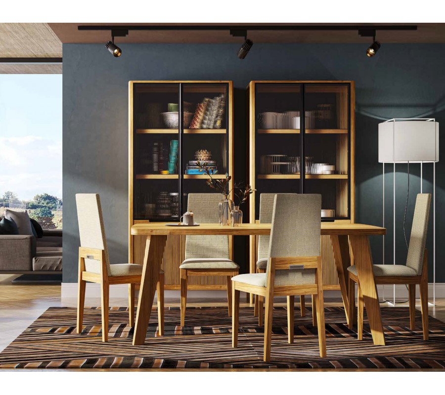 V centru sestavy se nachází obdélníkový jídelní stůl, dostupný ve třech rozměrech. Jeho rovné linie působí moderním minimalistickým dojmem, zjemněným zaoblenými rohy a hranami. Výborně jej doplňují čalouněné jídelní židle se zajímavým designovým prvkem ve spodní části zádové opěrky. Potah vytvoří v místnosti stylový akcent, ať už v jednobarevném nebo vzorovaném provedení. Dominantní dekorativní prvek a zároveň i funkční úložný prostor poskytuje vysoká vitrína s vrchními prosklenými a spodními plnými dvířky. Její fasádu zdobí vertikální žebrování, přinášející charakteristický art deco vizuál.