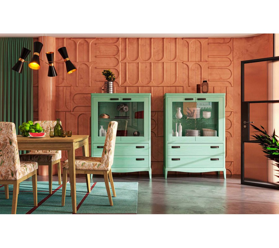 V centru sestavy se nachází rozkládací jídelní stůl, ideální pro každodenní i příležitostné stolování, s kapacitou až 8 osob. Ozdobná lišta pod vrchní deskou mu dodává venkovský charakter a zešikmené nohy výborně korespondují s designem čalouněných židlí. Potah přinese do místnosti stylový akcent, ať už preferujete sofistikované jednobarevné provedení nebo výraznější vzory. Dostatek úložného prostoru zajistí vitrína s prosklenou vrchní částí, ideální například pro vystavení porcelánu či křišťálu. Její spodní část doplňuje lišta tvarovaná do oblouku, která působí jako tradiční dekorativní prvek.
