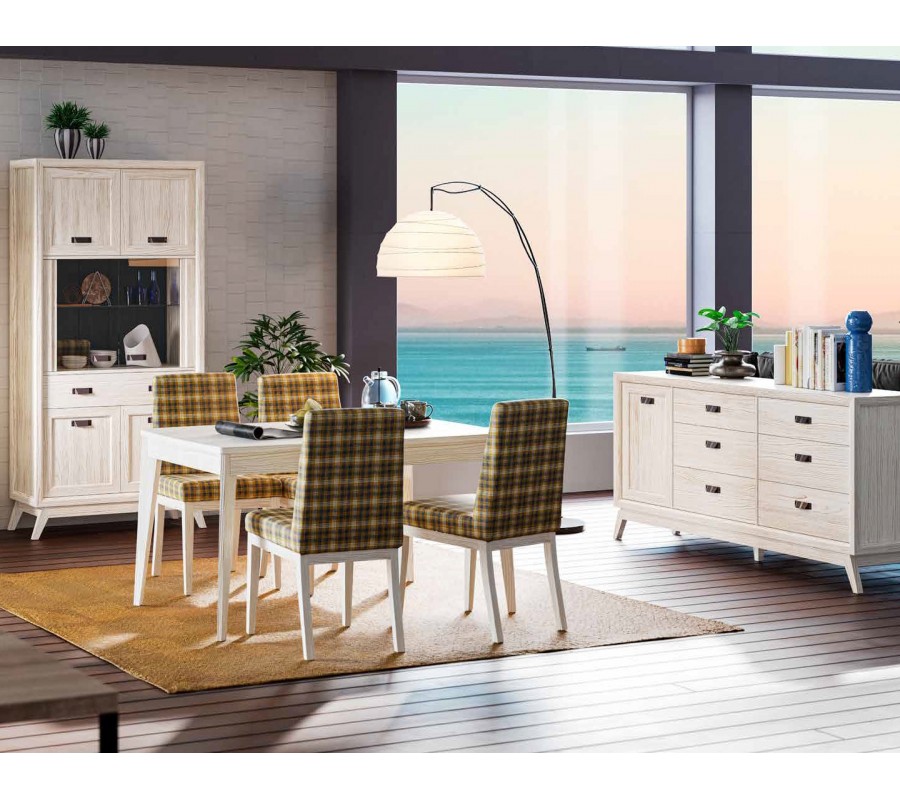 V centru sestavy se nachází obdélníkový jídelní stůl, který je dostupný ve třech rozměrech. Zaoblené rohy mu dodávají eleganci a zešikmené nohy působí dynamickým moderním dojmem. Vizuálně se propojují s podstavami vysoké vitríny a příborníku, které jsou také mírně zkosené. Úložné prostory mají vyvýšené rámy, což vytváří kazetový efekt v moderním provedení a dodává nábytku jemně venkovský výraz. Židle jsou na sedadle a zádové opěrce čalouněné a kombinace textilu se dřevem působí teplým a útulným dojmem.