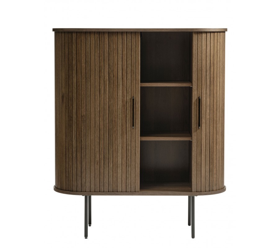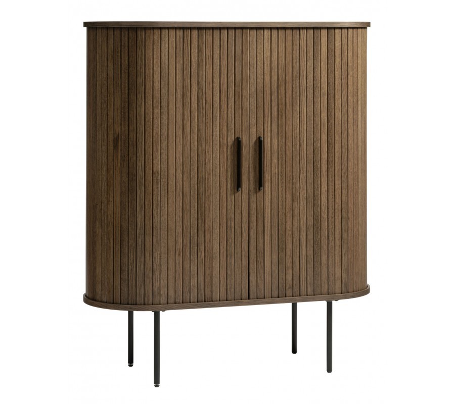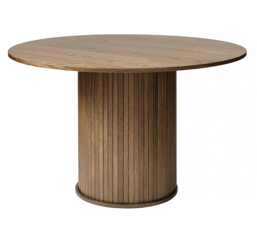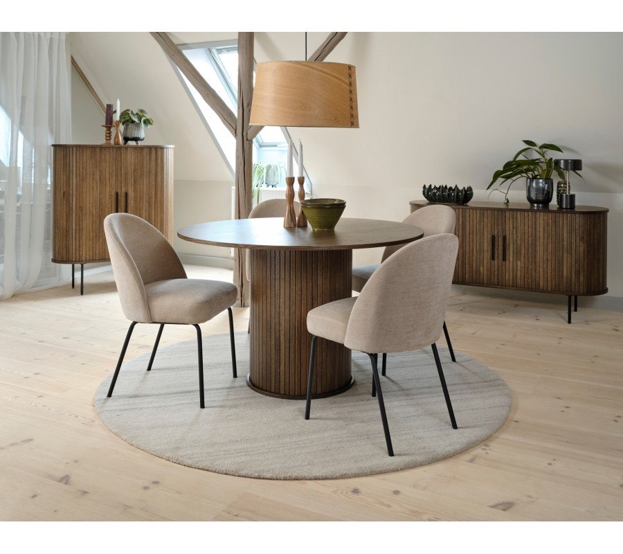 V sestavě dominují elegantní zaoblené a čisté tvary. Vertikální lamelový dekor vytváří lineární kontrast a v kombinaci se stylovými posuvnými dvířky úložných prostor odkazuje na retro inspiraci. Kulatý jídelní stůl doplňují uzavíratelné úložné prostory v podobě příborníku a barové skříňky. Nábytek je vyroben z kombinace pravé dubové dýhy a MDF. Tmavé hnědé provedení podtrhuje teplý přírodní severský vzhled. Čalouněné židle ve světém pískovém odstínu béžové vytvářejí jemný světlý kontrast. Měkký vizuál ženilkového potahu a jeho teplé podtóny krásně doladí naturální charakter dřeva, zatímco kovové nožičky se propojí s provedením úchytek.