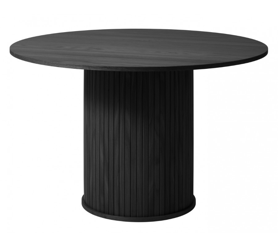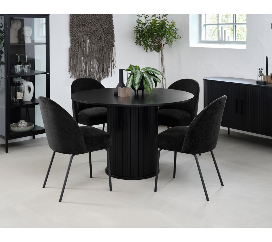 V centru sestavy se nachází kulatý jídelní stůl, který designově doplňuje oválný příborník. Jsou vyrobeny z dubové dýhy kombinované s MDF. Černá povrchová úprava zachovává subtilní strukturu dřeva a vizuálně je propojuje vertikální lamelový dekor, který činí z této dvojice elegantní základ místnosti.