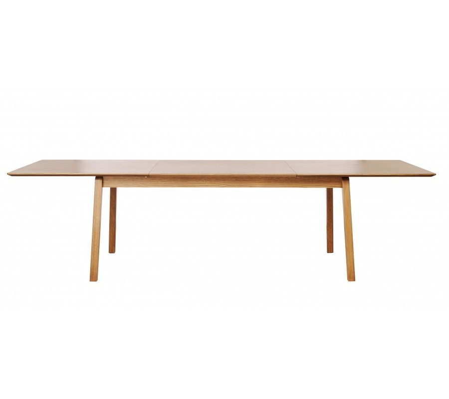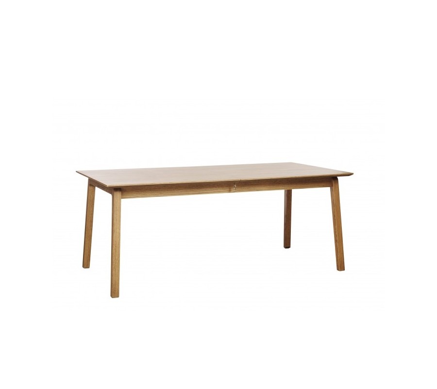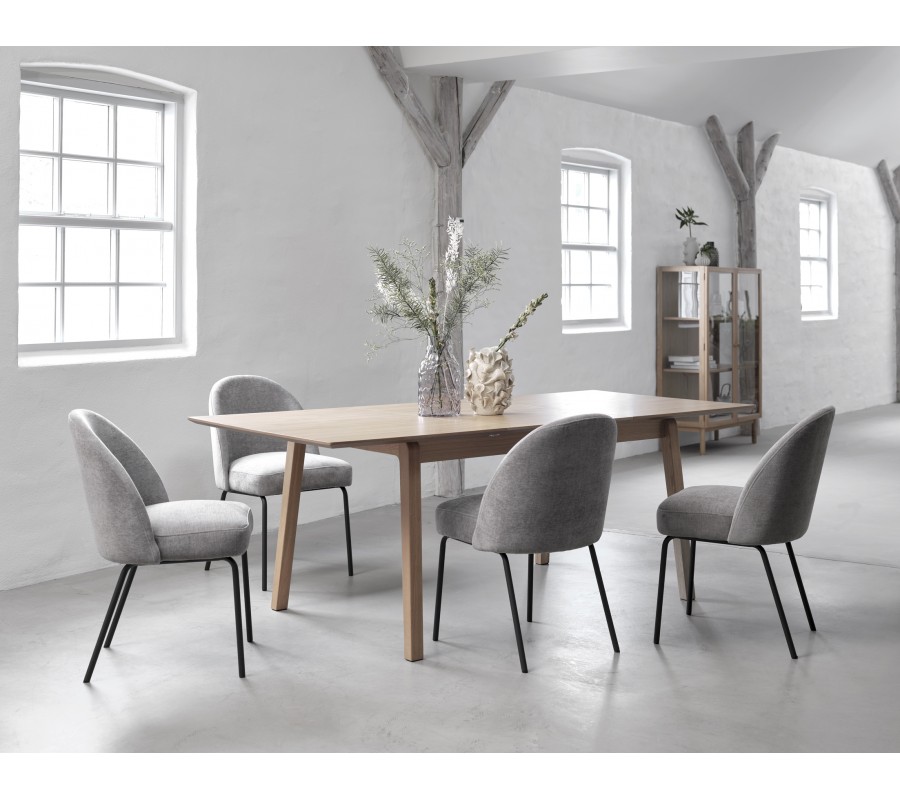 V centru sestavy se nachází obdélníkový rozkládací stůl, doplněný o prosklenou vitrínu se třemi policemi. V jejich designu dominují čisté tvary a rovné linie. Světlé hnědé dubové provedení s pravidelnou kresbou letokruhů dodává nábytku typický hřejivý skandinávský výraz.