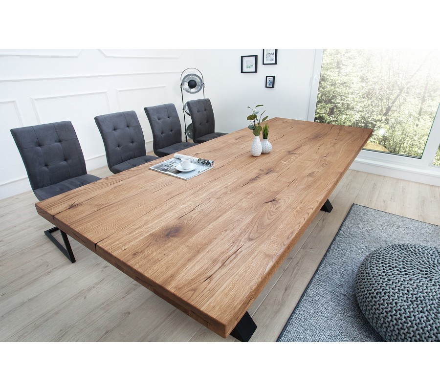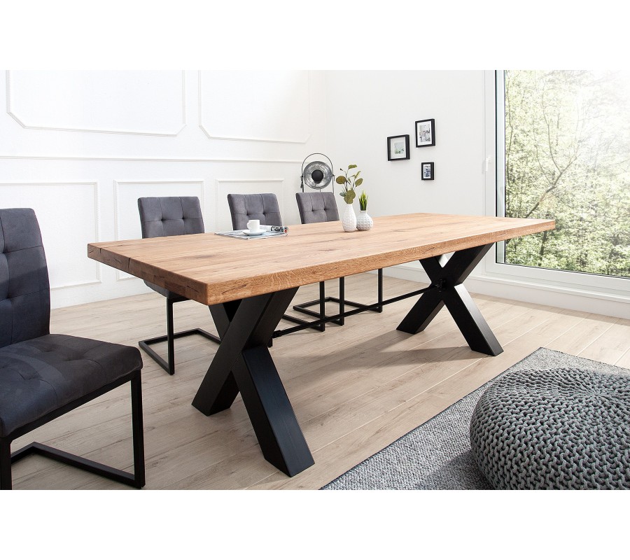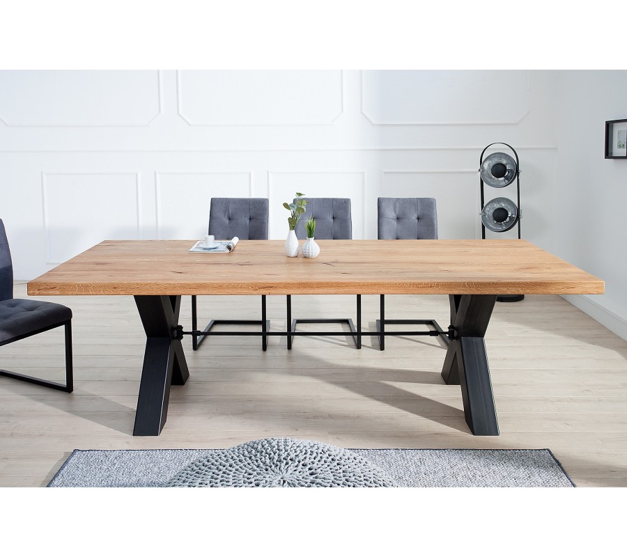 Luxusní industriální laděný jídelní stůl Thor může být dominantou i Vaší jídelny! Šířka 240cm zaručuje pohodlné sezení pro velký rodinný a přátelský kruh. Masivní vrchní deska je hrubá 60mm, díky čemuž budí opravdu solidní dojem. Váha stolu je přibližně 150kg. Stylová podstava do X dělá ze stolu jedinečný kousek nábytku.