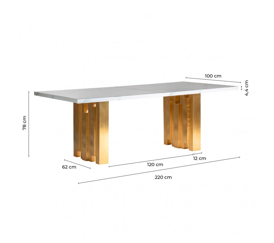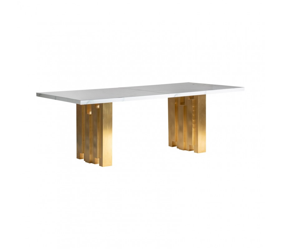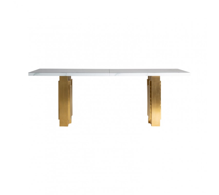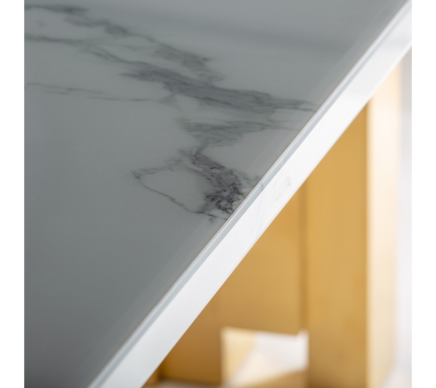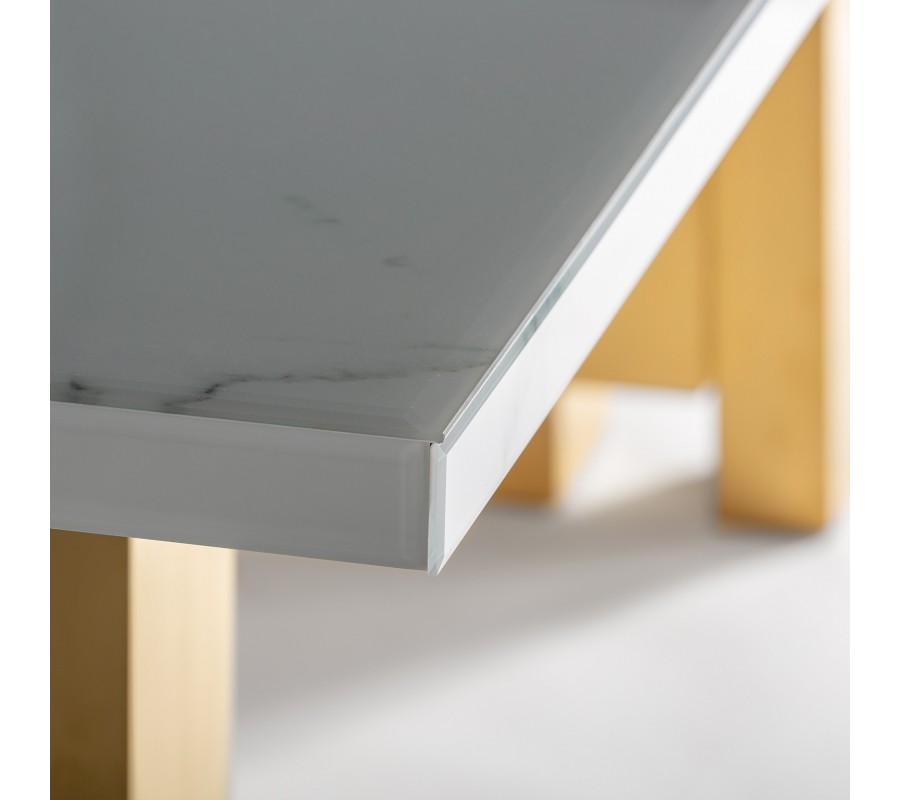 Art-deco luxusní skleněný jídelní stůl Moraira bílé barvy se zlatým kovovým nohama 220cm