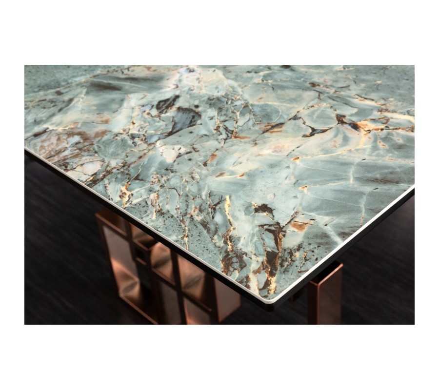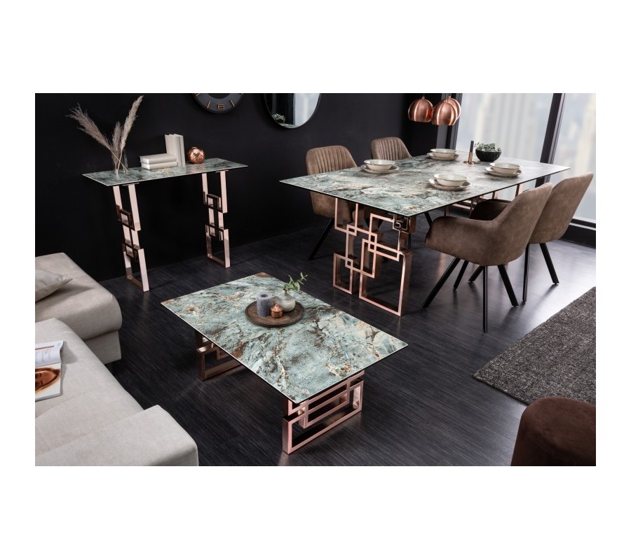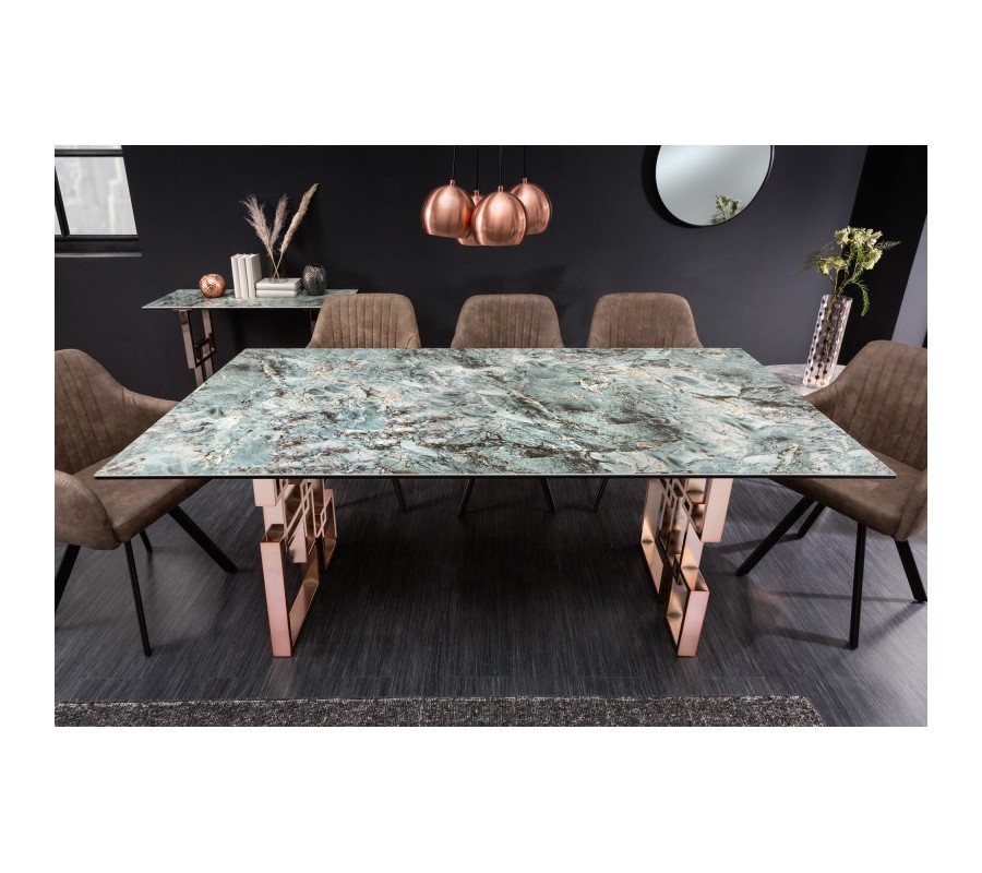 Art-deco obdélníkový jídelný stůl Ariana s tyrkysově modrou vrchní deskou s mramorovým vzhledem a růžovou podstavou 200cm