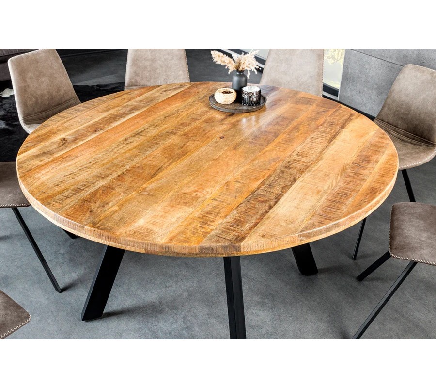 Vrchní deska je vyrobena z masivního mangového dřeva v přírodní hnědé barvě slakovanou povrchovou úpravou, která zajišťuje ochranu při každodenním používání a zároveň zvýrazňuje přirozenou kresbu a barevné přechody dřeva. Kulatý tvar desky podporuje příjemnou atmosféru při stolování a umožňuje přirozenou komunikaci mezi všemi sedícími.