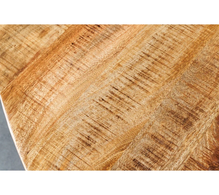 Stabilitu zajišťují čtyři kovové nožičky v černé barvě s práškovým nástřikem, které dodávají stolu pevnost a výrazný industriální vzhled. Kontrast mezi teplým tónem mangového dřeva a tmavou kovovou konstrukcí působí vyváženě.