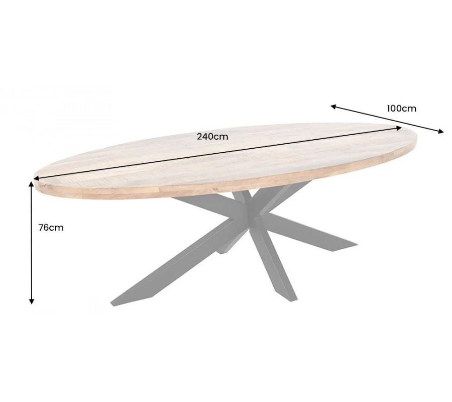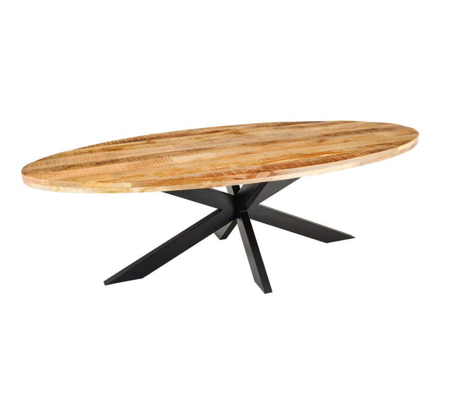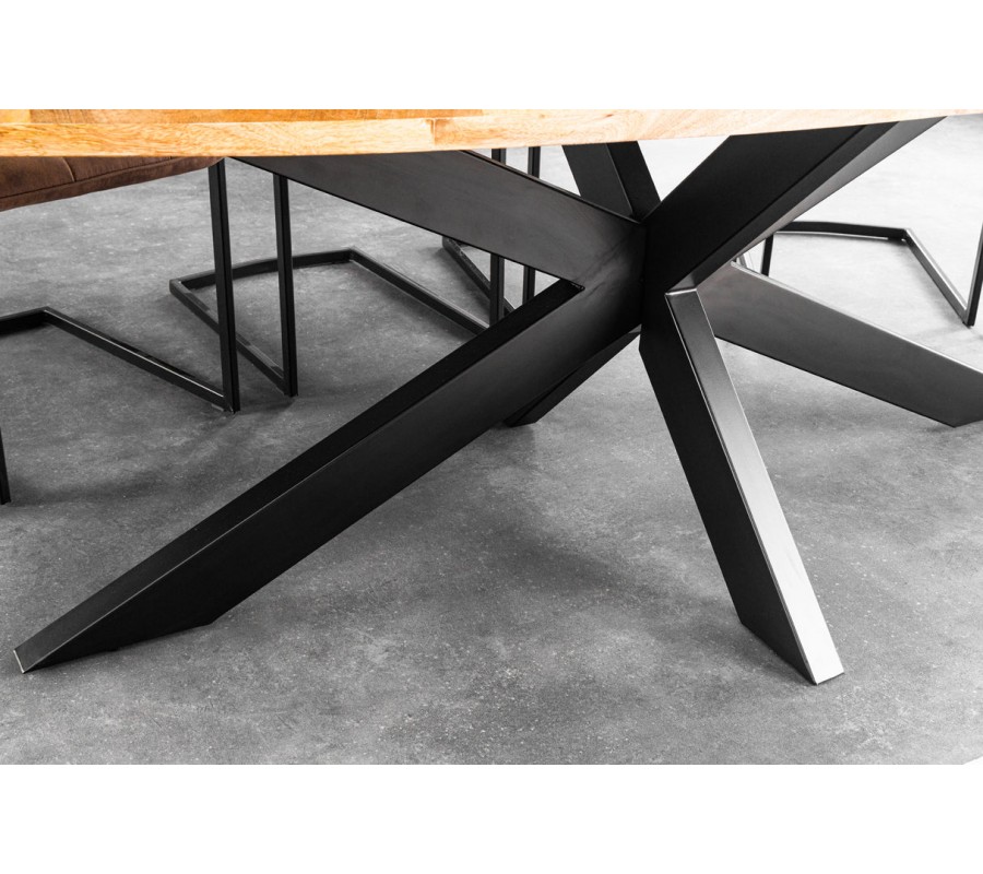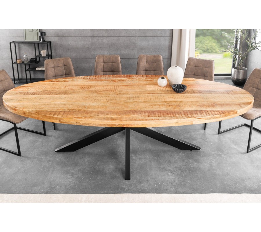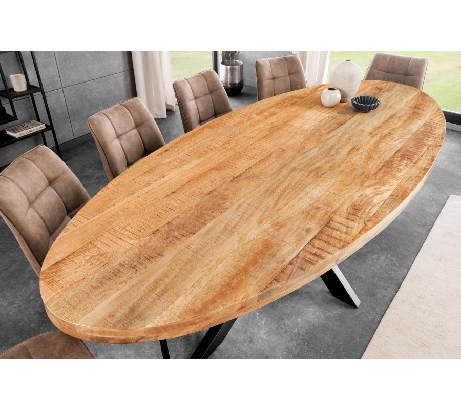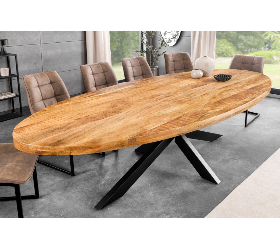 Masivní industriální oválný jídelní stůl Comedor se světlou hnědou mangovou deskou a překříženýma černýma nohama 240 cm