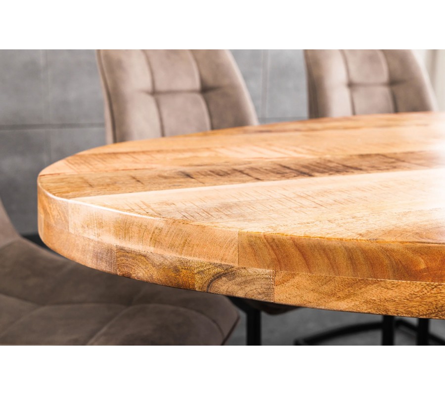 Vrchní deska má oválný tvar a je složena z lineárně umístěných latí z masivního mangového dřeva. Spoje a povrch jsou hladce obroušeny, takže deska je praktická a zároveň přinese do jídelny zajímavý dekorativní prvek. Světlou hnědou barvu dřeva doplňuje expresivní kresba letokruhů v tmavších odstínech a příležitostné patinování, což podtrhuje industriální charakter nábytku.