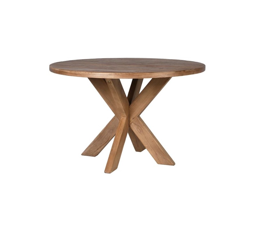 Stůl má kulatou desku s průměrem 119 cm, což je ideální velikost pro 4 osoby, přičemž každý má dostatek prostoru pro pohodlné stolování. Podnož tvoří designový prvek ve tvaru čtyř hranatých plochých šipek, které se spojují uprostřed pod stolovou deskou. Tento jedinečný detail vytváří efekt zkřížených nohou, ačkoli se ve skutečnosti jedná o sofistikovanou a pevnou konstrukci, která stolu zaručuje výjimečnou stabilitu.