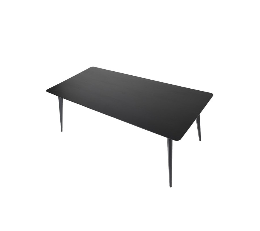Stůl stojí na štíhlých kovových nožičkách v matné černé barvě, které jsou mírně vyosené směrem ven a elegantně zaoblené. Tento detail zaručuje stabilitu a zároveň dodává konstrukci odlehčený a moderní vzhled.