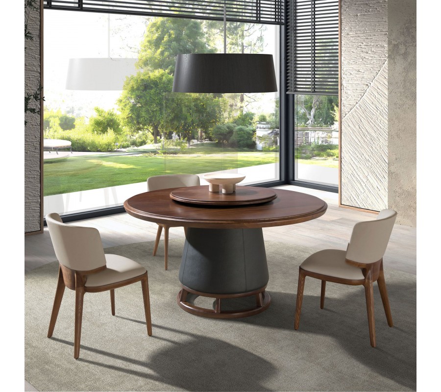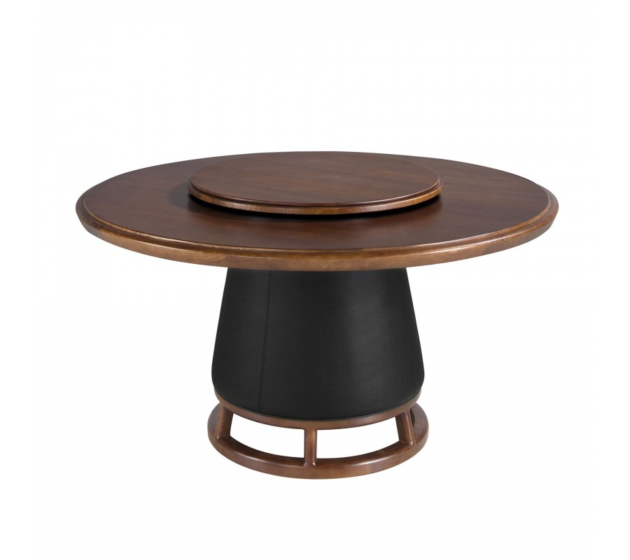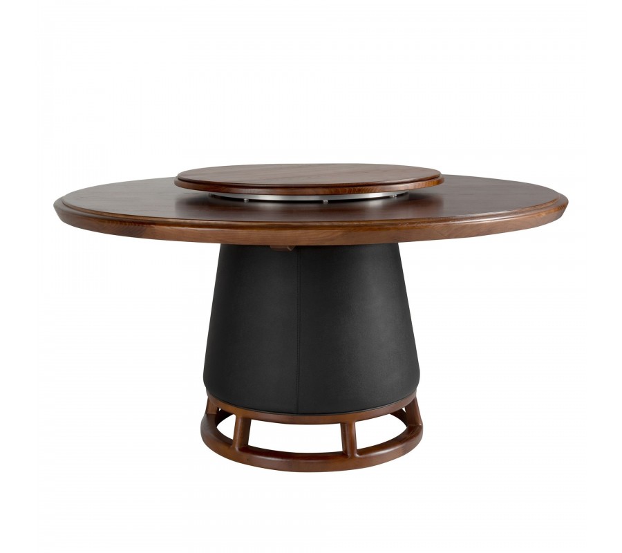 Luxusní moderní hnědý kulatý jídelní stůl Vita Naturale s odnímatelným podnosem a nohou s černým koženým potahem 150 cm