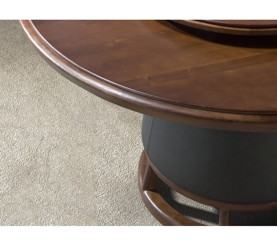 Stůl je vyroben z masivního dřeva a lakován v tmavě hnědé ořechové barvě. Má kulatou vrchní desku o průměru 150 cm, za kterou se pohodlně usadí 6 osob. Boční hrana je zaoblená, se schůdkovou lištou ve vrchní části. Stejný design se opakuje i na kulatém středovém podnosu s otočnými kolejničkami, který je součástí balení. Po jeho odebrání zůstane hladká vrchní deska, bez přípojných mechanismů, takže stůl můžete komfortně používat s podnosem i bez něj.