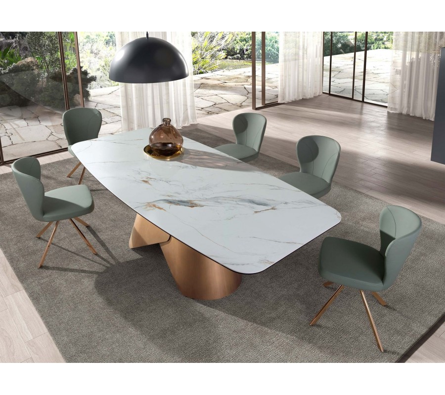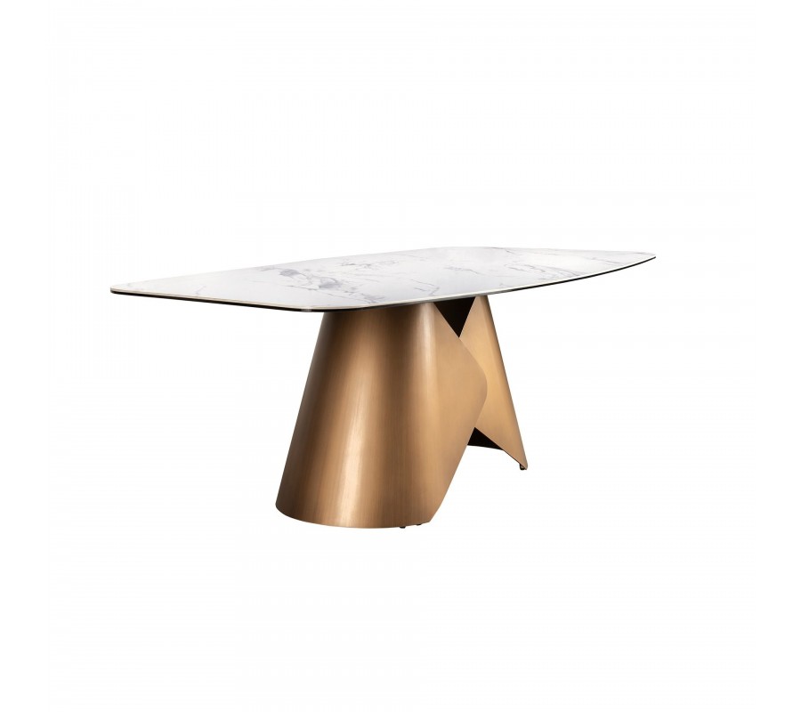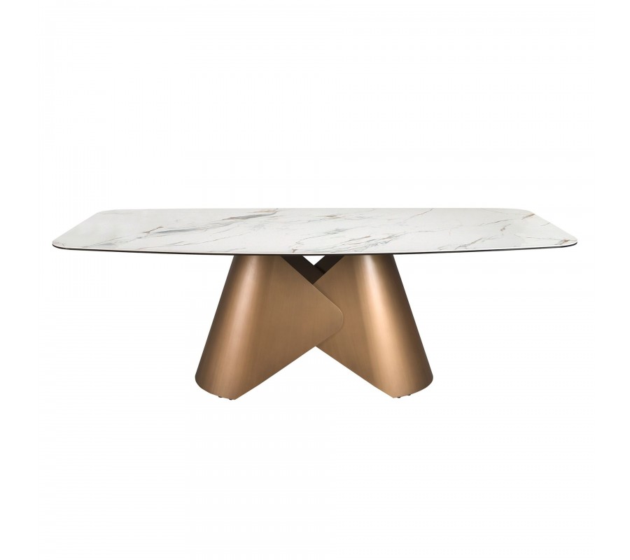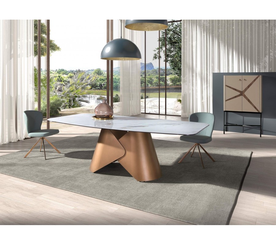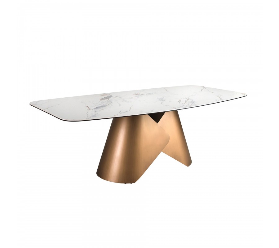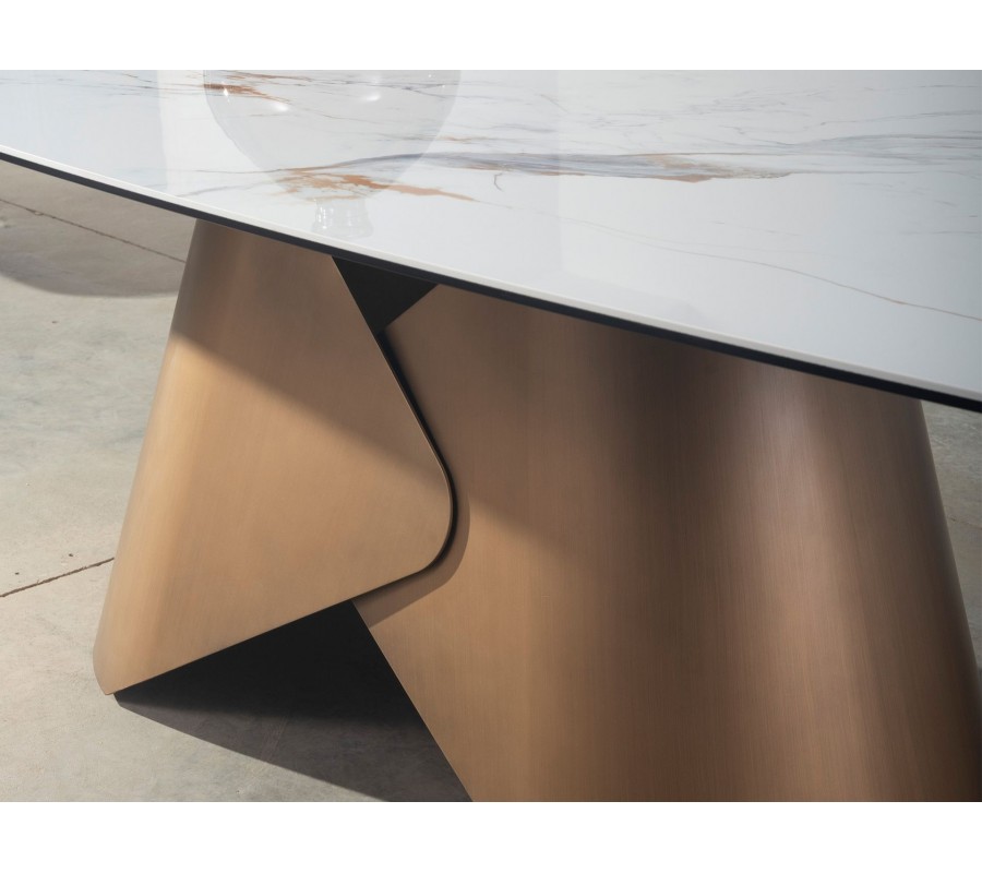 Dominantním prvkem celého stolu je jeho robustní noha atypického tvaru, je vyrobena z nerezavějící oceli v bronzové barvě s jemným leskem. Noha zajišťuje maximální stabilitu, zatímco působí jako sochařský prvek, což zvyšuje její estetickou hodnotou. Kombinace lesklého porcelánu s mramorovou kresbou a bronzovou barvou podtrhuje glamour charakter stolu. Je navržen tak, aby poskytl dostatek prostoru až pro deset osob, čímž se stává ideálním místem pro rodinné večeře, a jiná společenská setkání.