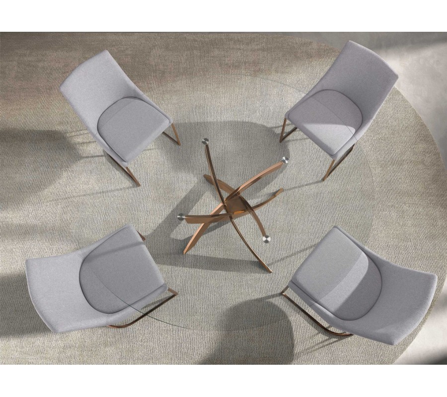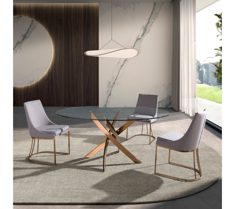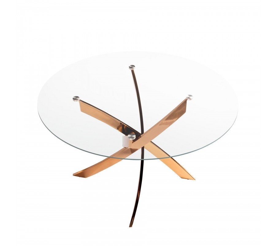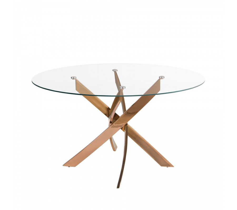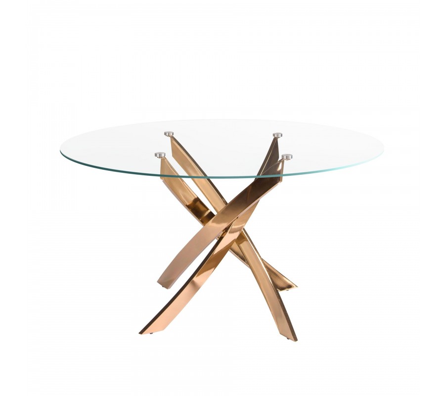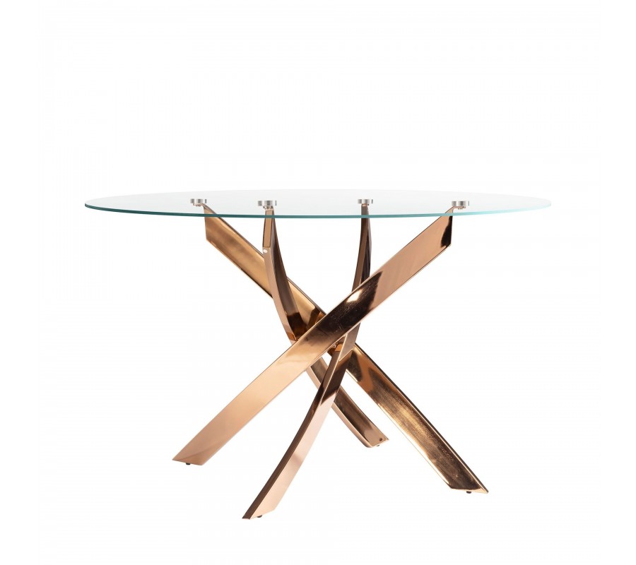 Luxusní glamour kulatý jídelní stůl Forma Moderna z tvrzeného skla s ocelovou překříženou zlato růžovou nohou 130 cm