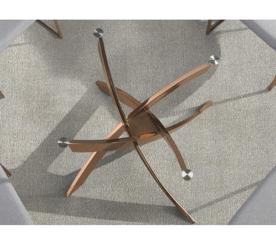 Nosným prvkem stolu je jedna asymetrická noha, která má výrazný umělecký charakter. Tvoří ji čtyři překřížené obdélníkové pásy z nerezové oceli ve zlaté barvě s růžovým podtónem, známým také jako rosegold. Tento typ kovové povrchové úpravy vnáší do prostoru noblesu a dodává stolu moderní, ale zároveň hřejivý charakter. Dynamické uspořádání pásů vytváří dojem pohybu a dodává stolu sochařský nádech.