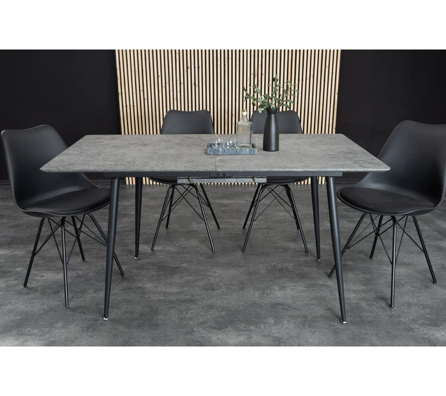Moderní industriální rozkládací obdélníkový jídelní stůl Maison je praktickým a zároveň designově čistým řešením pro současné interiéry. Vyznačuje se jednoduchou siluetou, jemně oblými rohy a vyváženou kombinací kamenného vzhledu desky a štíhlé kovové konstrukce, díky čemuž působí moderně, nadčasově a vzdušně.
