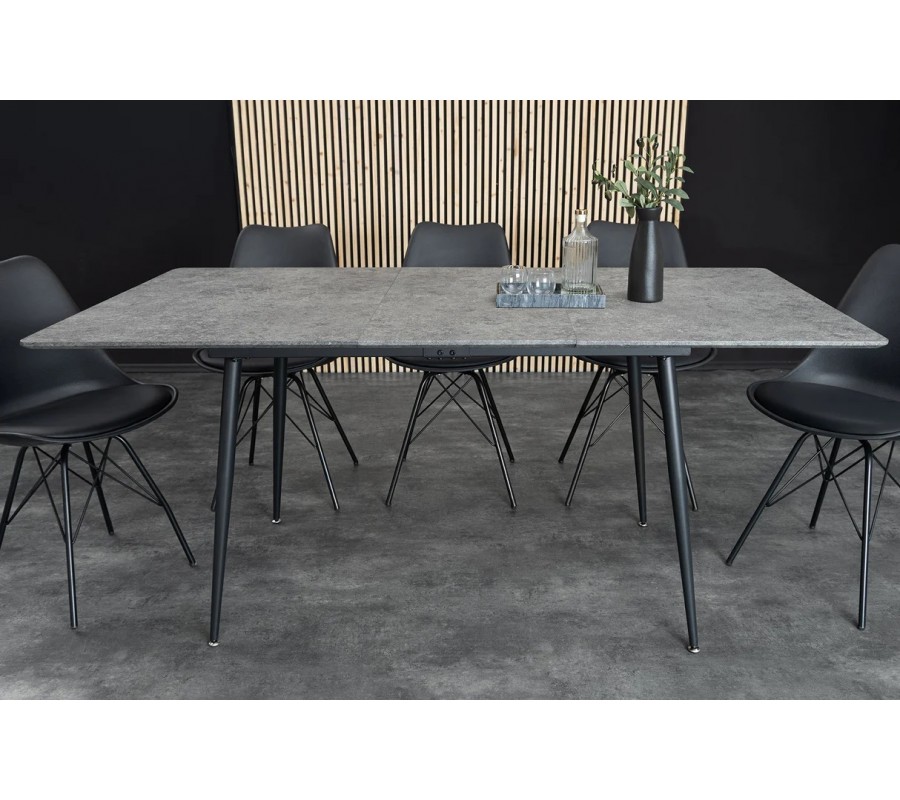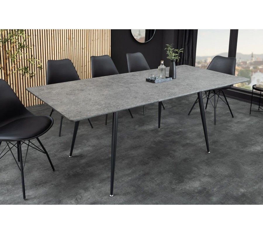 Moderní industriální rozkládací obdélníkový jídelní stůl Maison je praktickým a zároveň designově čistým řešením pro současné interiéry. Vyznačuje se jednoduchou siluetou, jemně oblými rohy a vyváženou kombinací kamenného vzhledu desky a štíhlé kovové konstrukce, díky čemuž působí moderně, nadčasově a vzdušně.