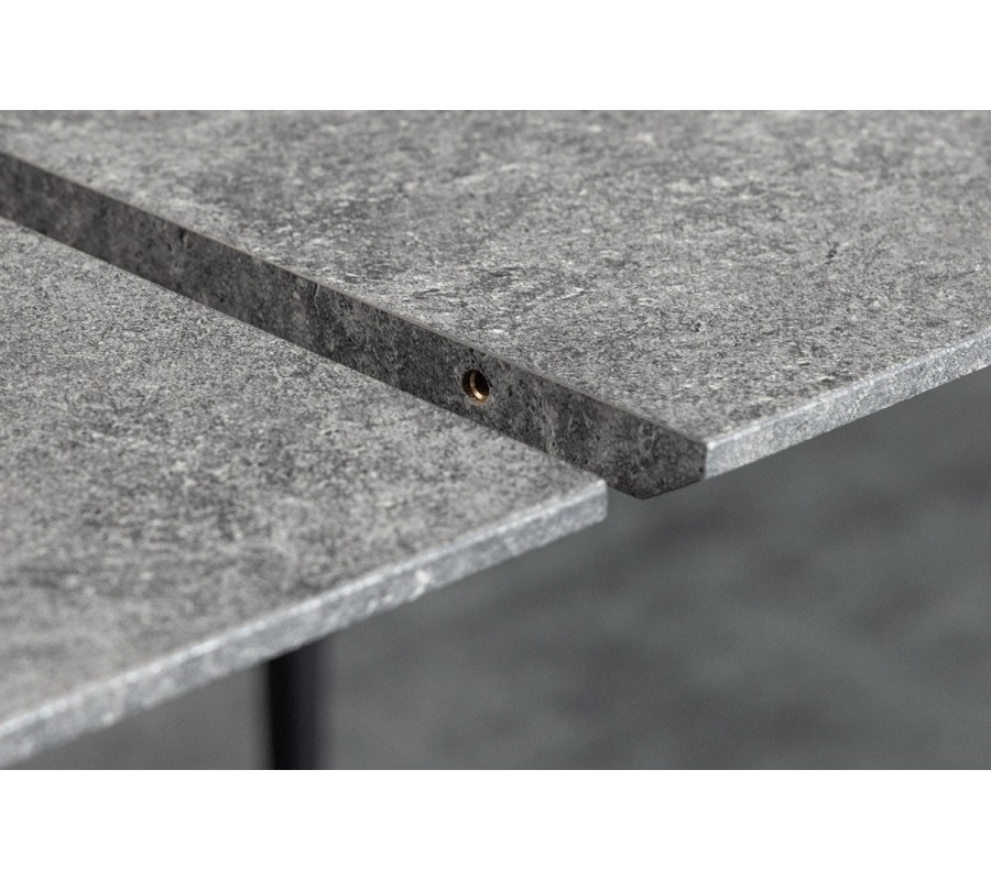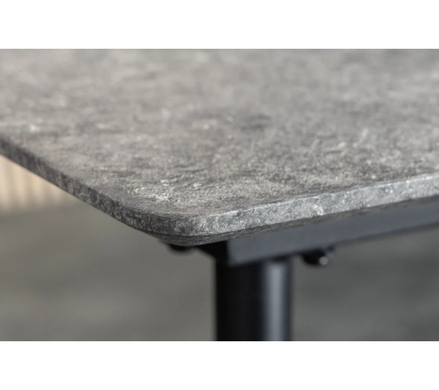 Vrchní deska je vyhotovena z dřevěné dýhy s kamenným, mramorovým designem v šedé barvě. Tento povrch dodává stolu elegantní a neutrální charakter, působí klidně a decentně a zároveň se snadno kombinuje s různými materiály a barevnými tóny v interiéru.Oblé rohy zjemňují celkový tvar stolu a přispívají k bezpečnosti i vizuální harmonii.
