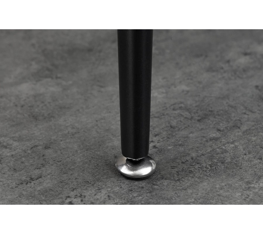 Podnož tvoří hladké černé kovové nožičky s matnou povrchovou úpravou, které jsou mírně vyosené směrem ven a směrem dolů se jemně zužují. Tento tvar dodává stolu stabilitu, vizuální lehkost amoderní industriální výraz bez zbytečné robustnosti.