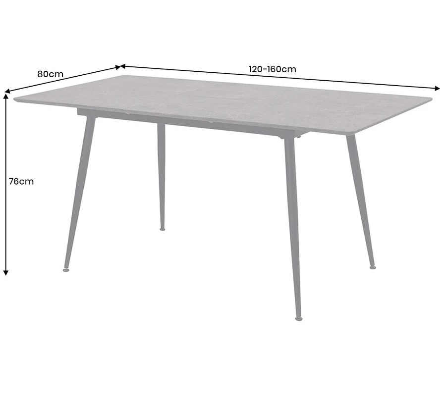 Stůl je rozkládací v rozsahu od 120 do 160 cm. Rozkládací mechanismus je integrován ve středové části stolu a umožňuje snadné zvětšení stolové plochy podle aktuální potřeby. V základním rozměru 120 cm poskytuje pohodlné místo pro čtyři osoby, po rozložení na 160 cm nabízí komfortní prostor pro šest osob. Díky tomu je vhodný pro každodenní používání i příležitostná rodinná či společenská setkání.