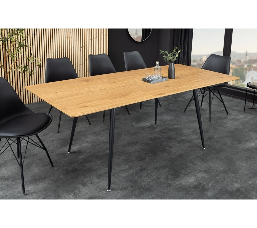 Podnož tvoří hladké černé kovové nožičky s matnou povrchovou úpravou, které se směrem dolů jemně zužují. Tento detail dodává stolu vizuální lehkost, stabilitu a moderní industriální výraz. Kontrast mezi teplým tónem dřeva a tmavou kovovou konstrukcí působí vyváženě a nadčasově.