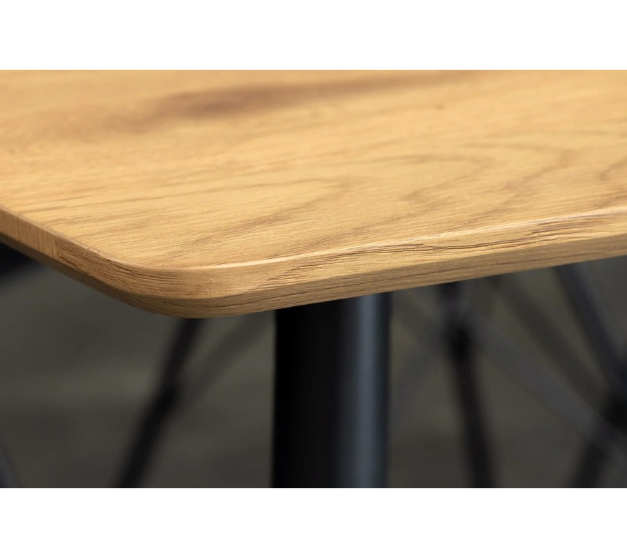 Podnož tvoří hladké černé kovové nohy, které jsou mírně vyosené směrem ven a směrem dolů se jemně zužují. Tento tvar dodává stolu vizuální lehkost, stabilitu a moderní industriální charakter bez působení robustně. Kontrast mezi světlou dřevěnou deskou a tmavou kovovou konstrukcí působí nadčasově a snadno kombinovatelně.