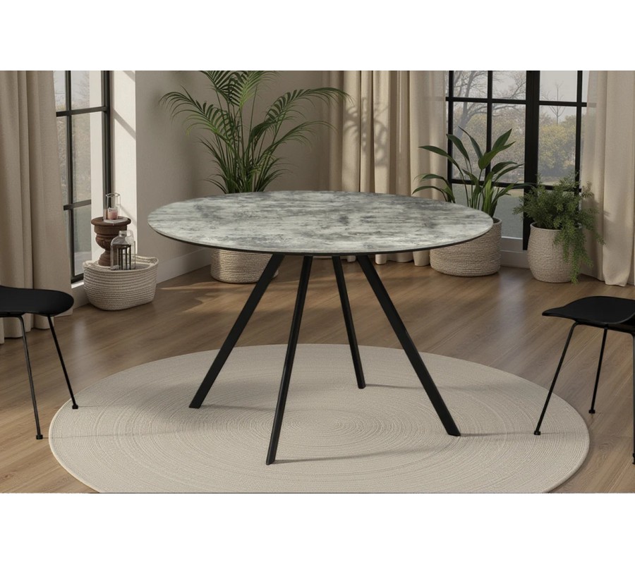 Industriální kulatý jídelní stůl Mefar vyniká vyváženým spojením surového industriálního stylu, moderního designu a jemného skandinávského nádechu, který klade důraz na čisté linie a funkčnost. Jeho dominantou je vrchní deska s mramorovým vzhledem v šedých odstínech, která dodává stolu výrazný a nadčasový charakter. Jemná kresba povrchu připomíná strukturu přírodního kamene, což činí stůl originálním a vizuálně zajímavým prvkem interiéru.