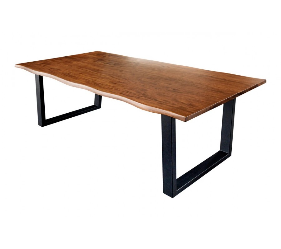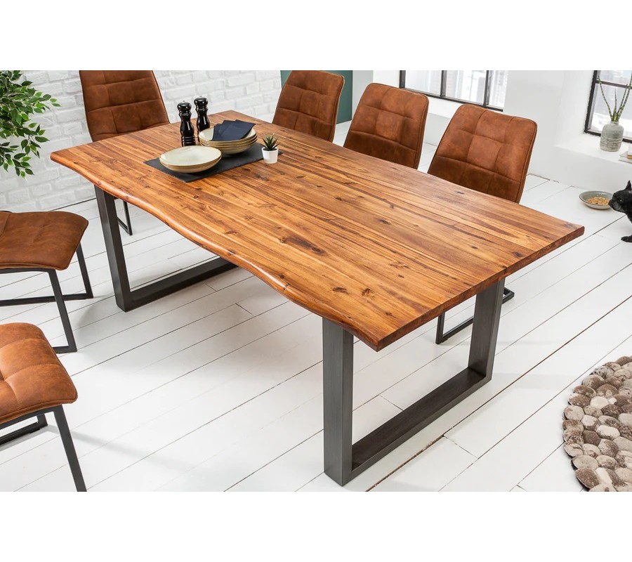 Stůl stojí na černých kovových nožičkách ve tvaru písmene U s matnou povrchovou úpravou, které zajišťují vysokou stabilitu a podtrhují industriální charakter celého designu. Kontrast mezi teplým tónem akácie a tmavou kovovou konstrukcí působí výrazně a nadčasově.