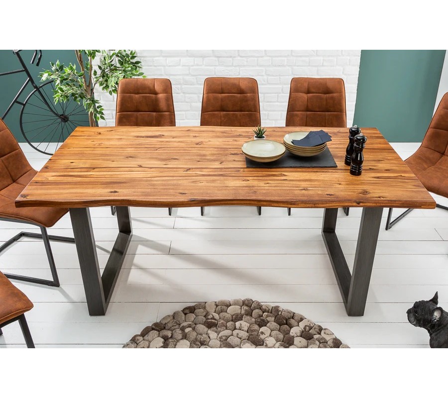 Industriální jídelní stůl Maron Miel je výrazným a charakterovým kusem nábytku, který v sobě spojuje sílu přírodního materiálu se surovým industriálním designem. Díky masivnímu zpracování a nadčasové kombinaci akace a kovu se přirozeně stává dominantou prostoru.