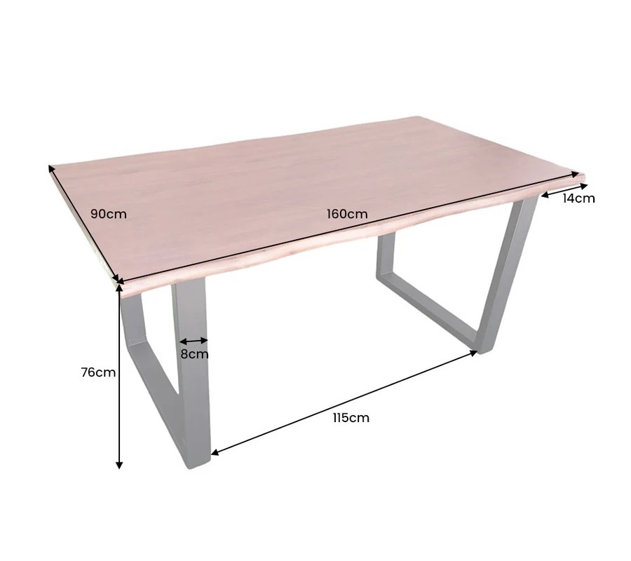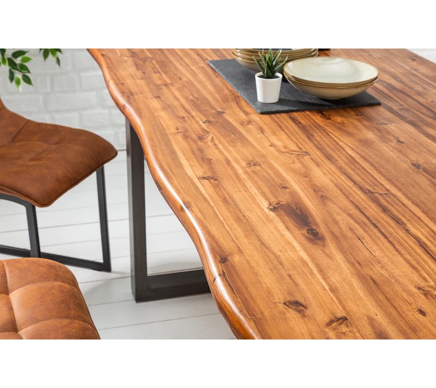Vrchní deska má obdélníkový tvar a je vyrobena z masivní akácie v hnědé barvě s olejovanou povrchovou úpravou. Ta chrání povrch a zároveň zvýrazňuje přirozenou kresbu, barevné přechody a výraznou strukturu materiálu. Delší hrany desky jsou zpracovány ve stylu live edge, který zachovává přirozené linie kmene a dodává stolu autentický, organický vzhled. Díky tomuto zpracování je každý kus originálem. Za stůl se pohodlně usadí šest osob.