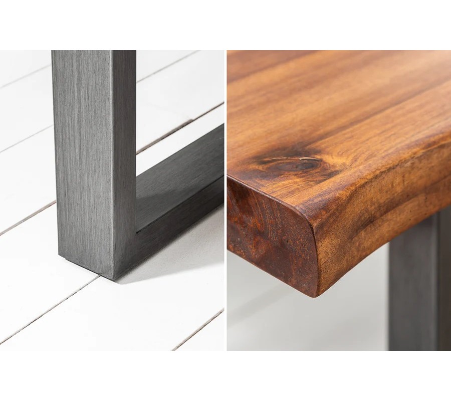 Stůl stojí na černých kovových nožičkách ve tvaru písmene U s matnou povrchovou úpravou, které zajišťují stabilitu, pevnost a typický industriální výraz. Kontrast mezi teplým tónem akácie a tmavou kovovou konstrukcí podtrhuje robustní, moderní charakter stolu.