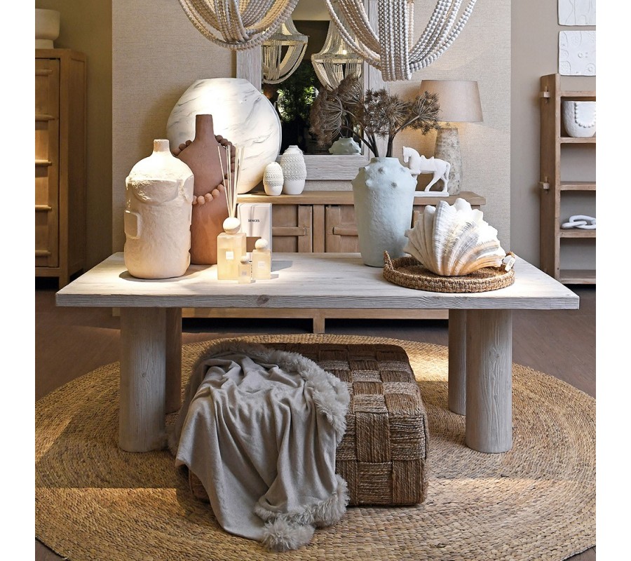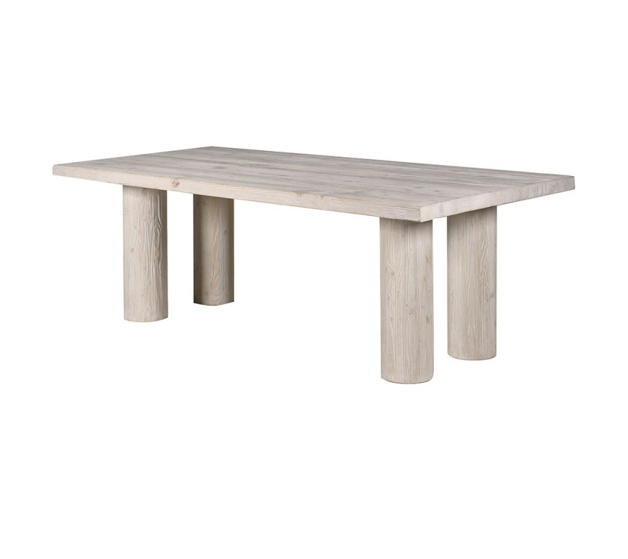 Minimalistickou geometrickou siluetu oživuje provedení z recyklovaného masivního dřeva. Tento materiál je ekologický a zároveň dodává každému kusu unikátní strukturu. Lakování ve světlé krémové barvě zdůrazňuje kresbu letokruhů a místy odhaluje naturální odstíny dřeva. Do jídelny přinese výrazný přírodní prvek.