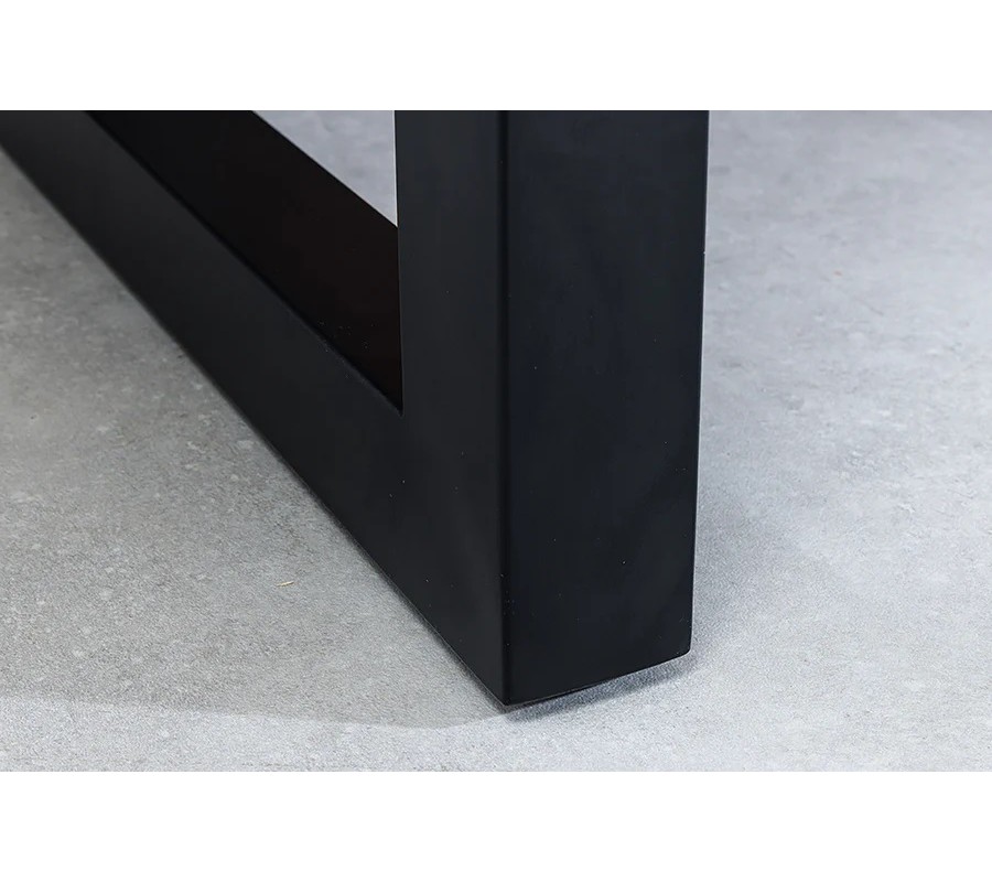Stabilitu a výrazný industriální vzhled zajišťují mohutné kovové nohy v černé barvě ve tvaru písmene U. Jejich masivní provedení dodává stolu pevnost, vizuální sílu a vytváří výrazný kontrast s teplým tónem dřevěné desky.