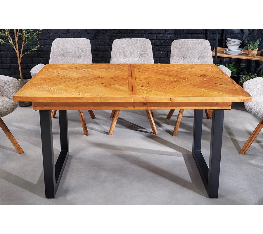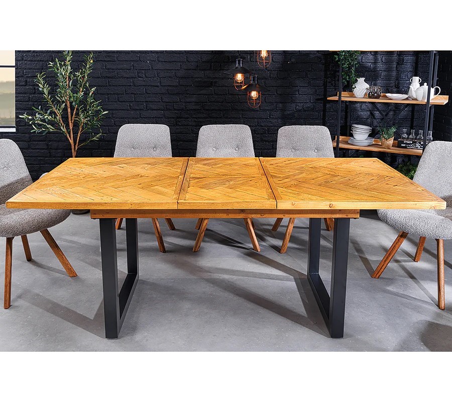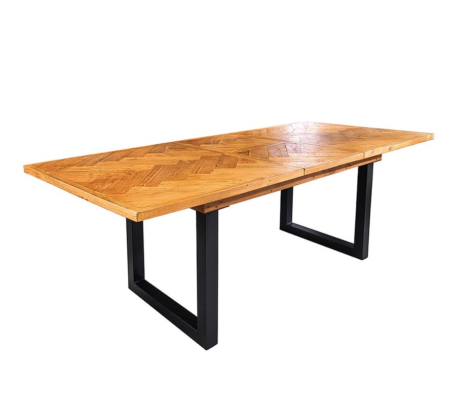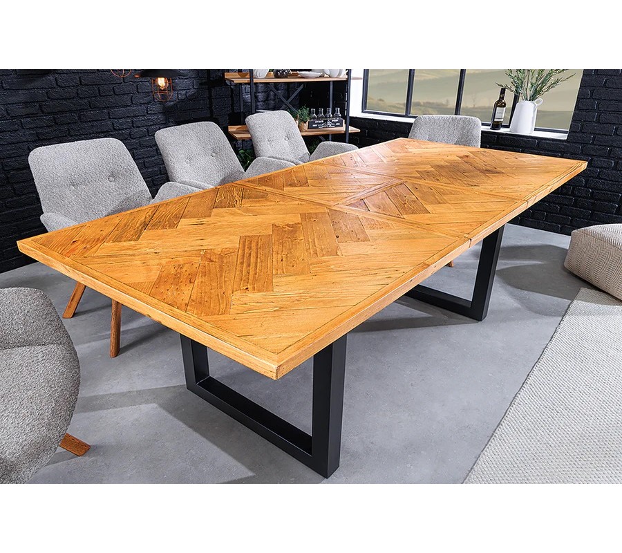 Industriální obdélníkový rozkládací jídelní stůl Perry je výrazným designovým prvkem, který spojuje autentický vzhled recyklovaného dřeva s pevnou kovovou konstrukcí. Díky kombinaci hnědé dřevěné desky s parketovým vzorem ačerných kovových nohou působí robustně, industriálně a zároveň nadčasově.