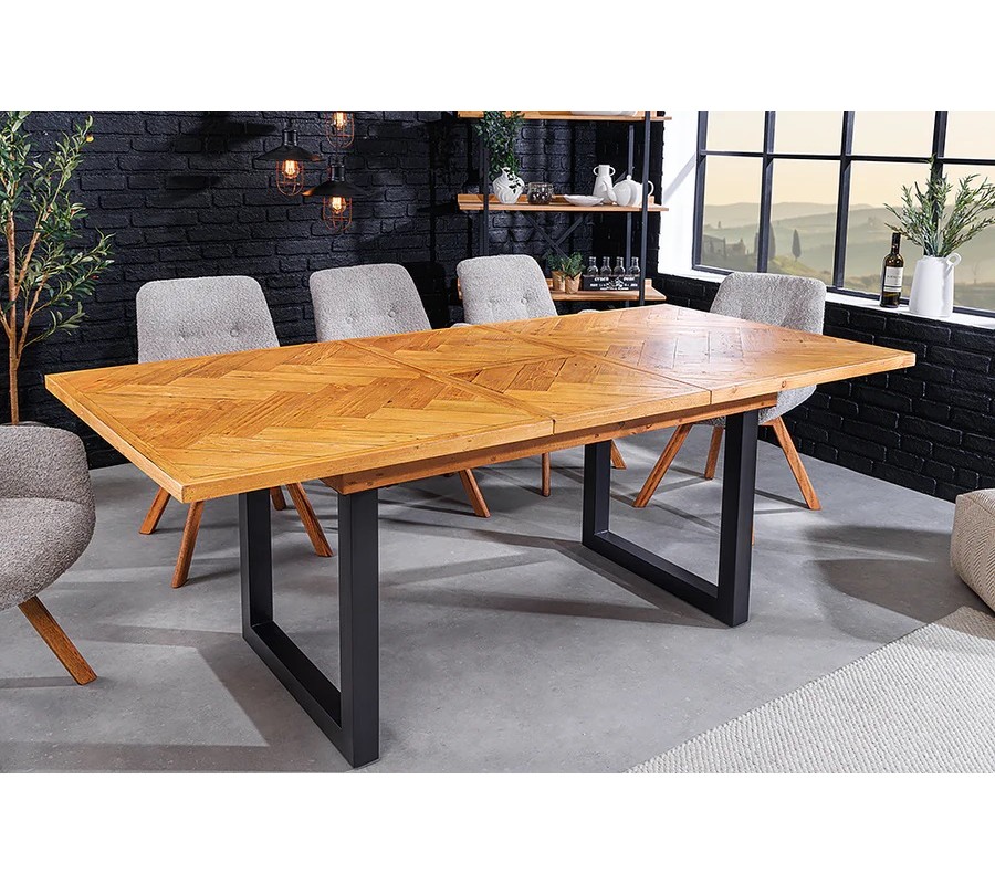 Industriální hnědý obdélníkový rozkládací jídelní stůl Perry s parketovým vzorem a černými kovovými nožičkami 140-180 cm