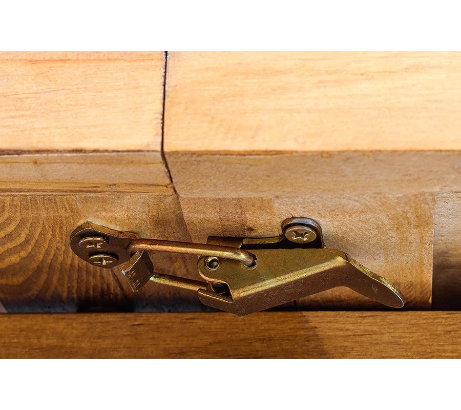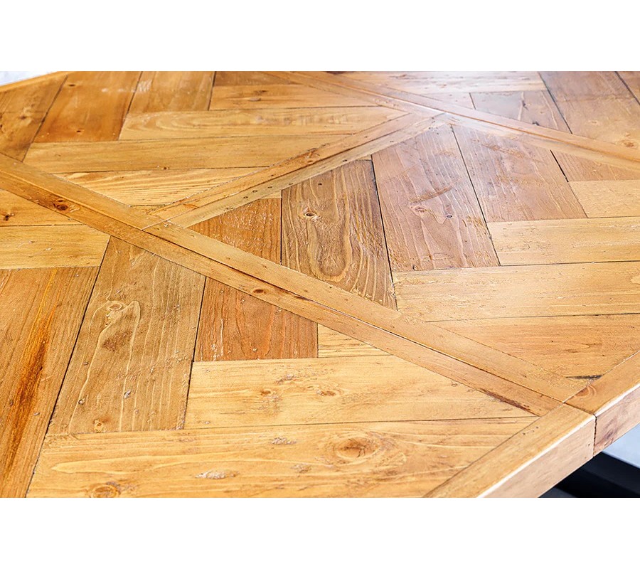 Vrchní deska je vyrobena z recyklovaného dřeva v hnědé barvě s výraznou kresbou letokruhů. Povrch je vyskládaný do parketového vzoru ve vzoru rybí kosti, který dodává stolu hloubku, originalitu a řemeslný charakter. Lakovaný povrch chrání dřevo při každodenním používání a zároveň zvýrazňuje jeho přirozenou strukturu a teplý tón.