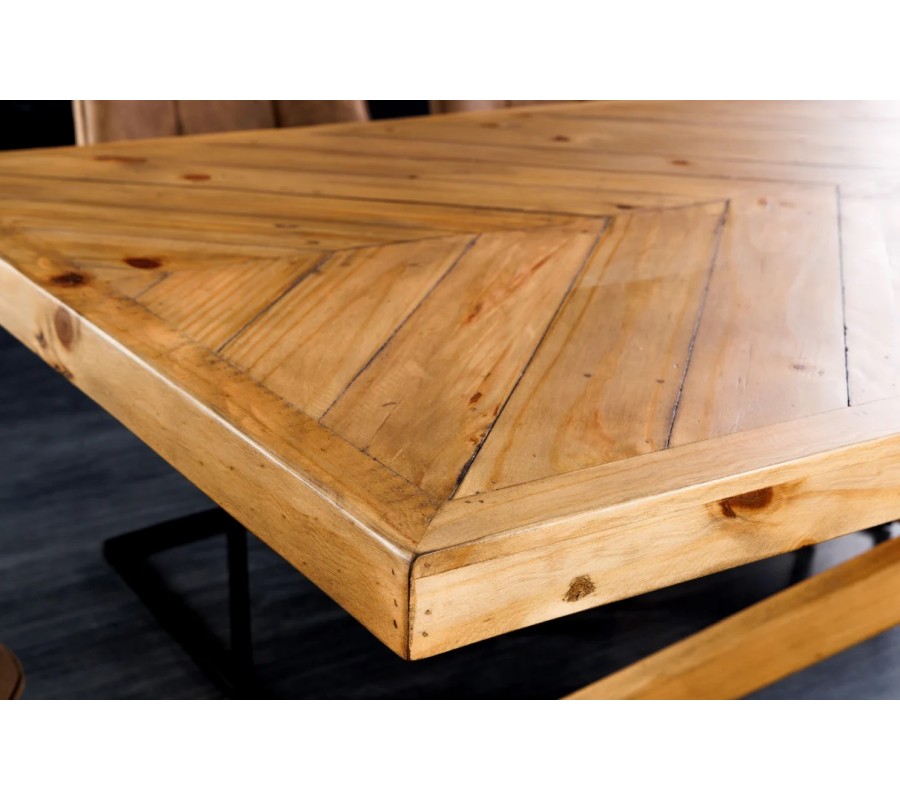 Vrchní deska zaujme parketovým vzorem rybí kosti, který je vyskládaný z dřevěných lamel s výraznou nepravidelnostmi a charakteristickou texturou typickou pro recyklované dřevo.Lakovaný povrch chrání dřevo při každodenním používání a zároveň zvýrazňuje jeho přirozenou kresbu a teplý tón.