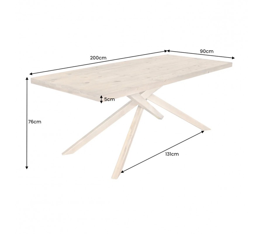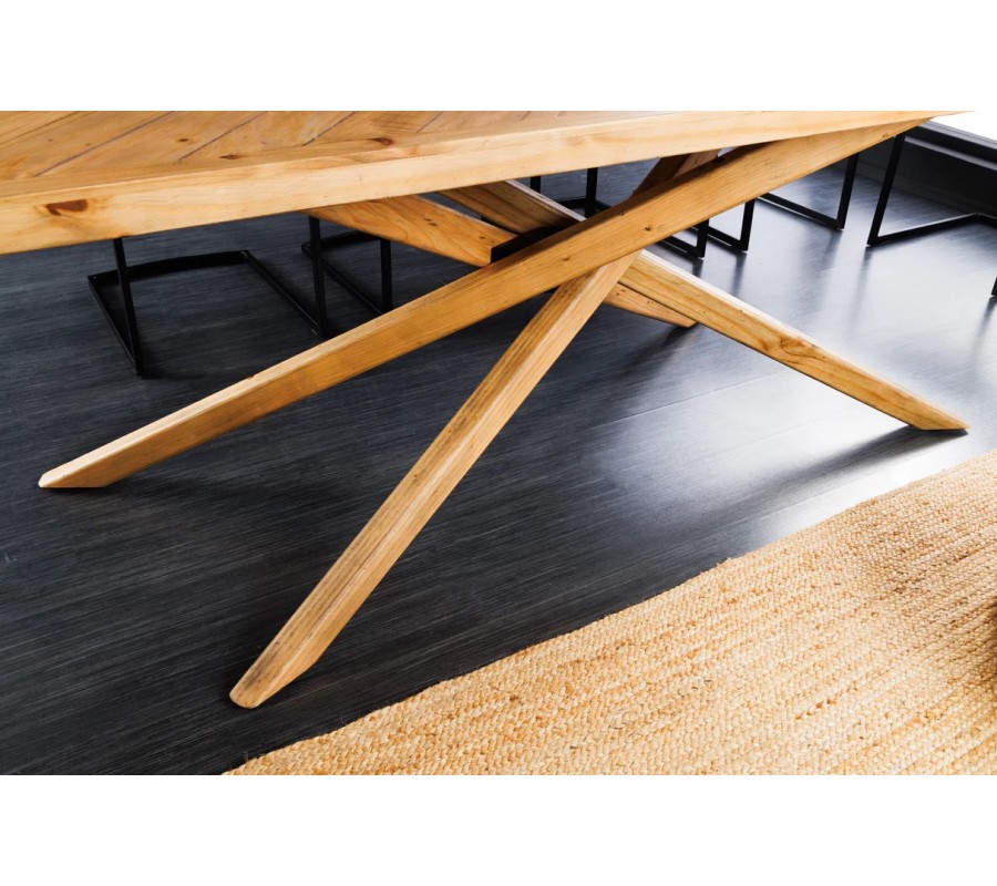 Stůl stojí na zkřížených masivních nožičkách, které se kříží pod deskou ve středové části. Tato konstrukce dodává stolu stabilitu, vizuální dynamiku a výrazný venkovský charakter, přičemž působí originálně a architektonicky zajímavě.