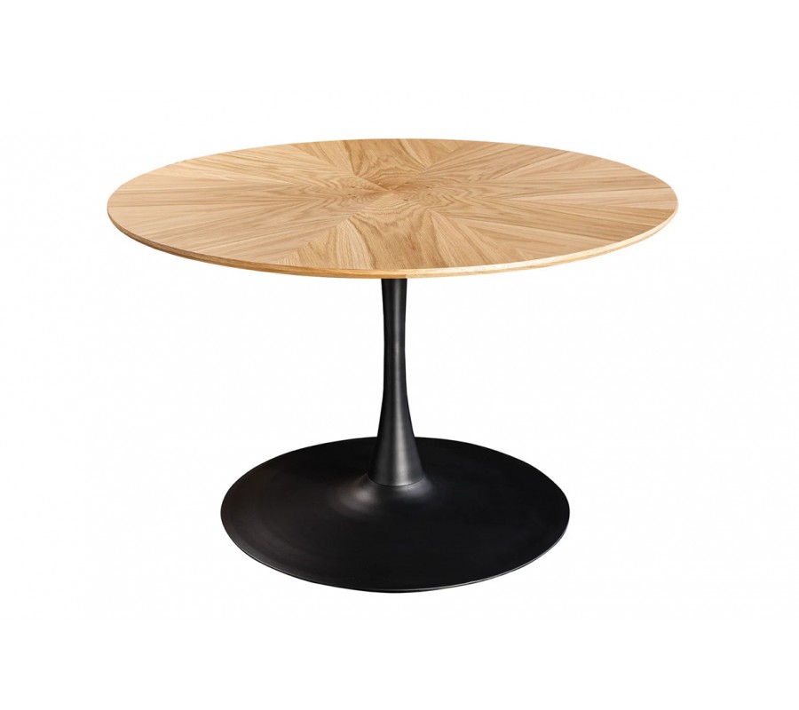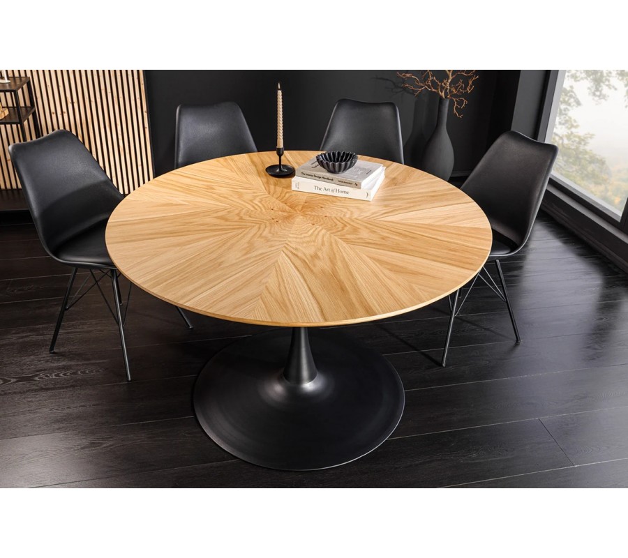 Designový moderní kulatý jídelní stůl Maderia s dubovou světlou hnědou deskou a černou kovovou nohou 120 cm