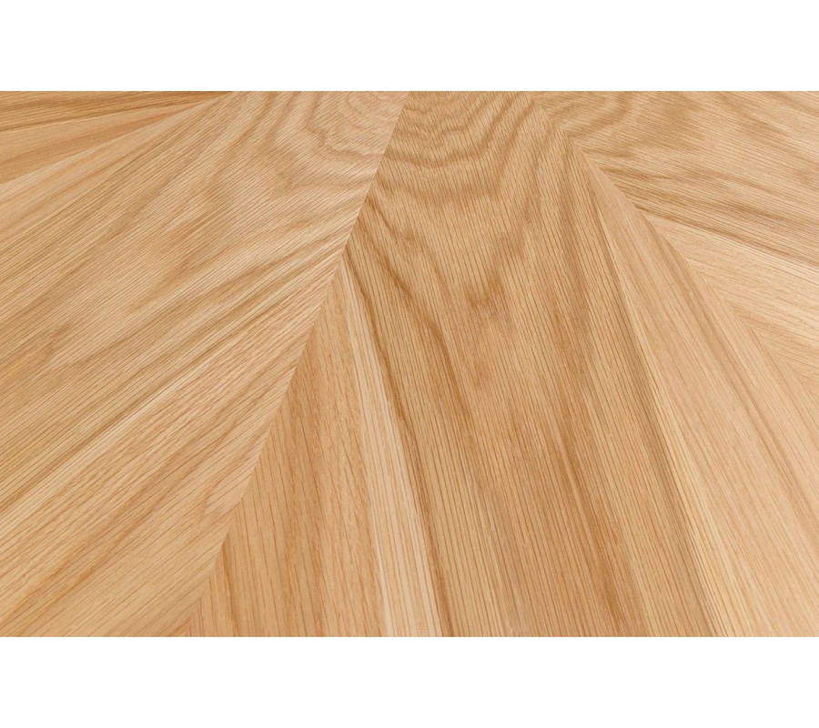 Vrchní deska je vyrobena z dubové dýhy v naturální světle hnědé barvě. Design originálně využívá estetickou kresbu letokruhů dřeva, jejíž linie paprskovitě vycházejí ze středu desky a připomínají vzor hvězdy. Kovová podstava v matném černém provedení působí minimalisticky a nechává naplno vyniknout dekorativní charakter vrchní části.
