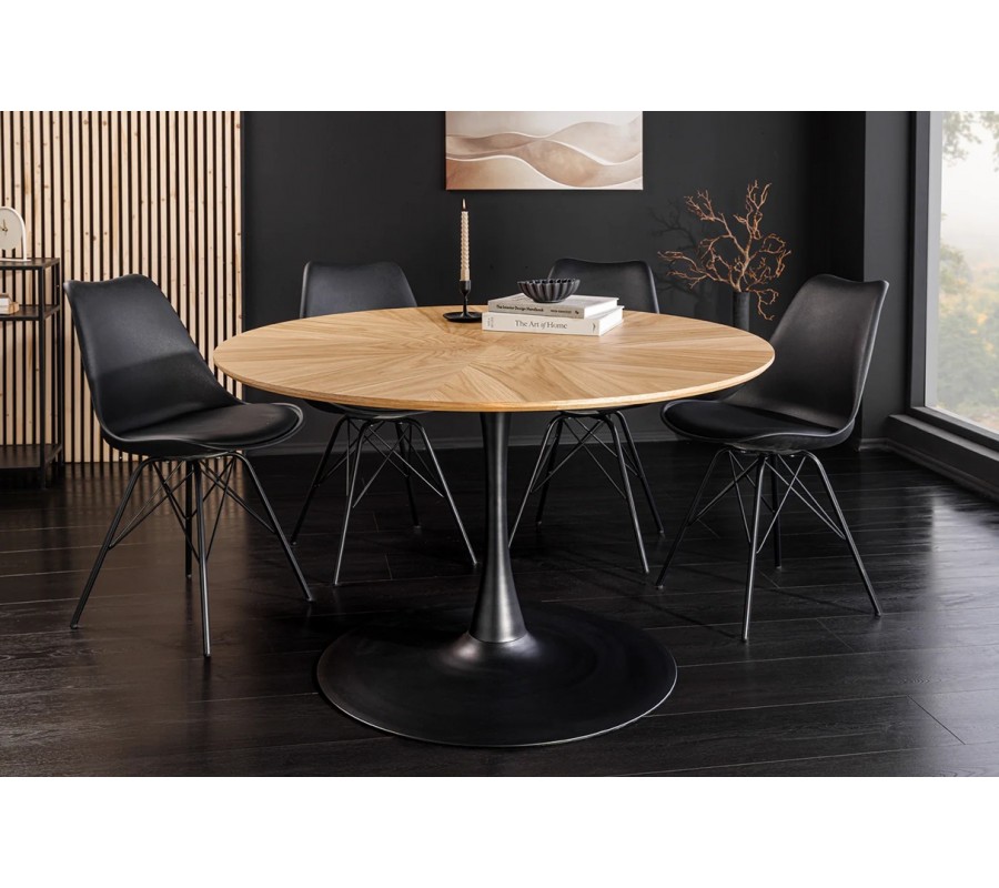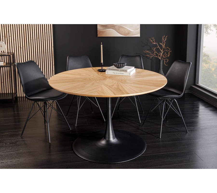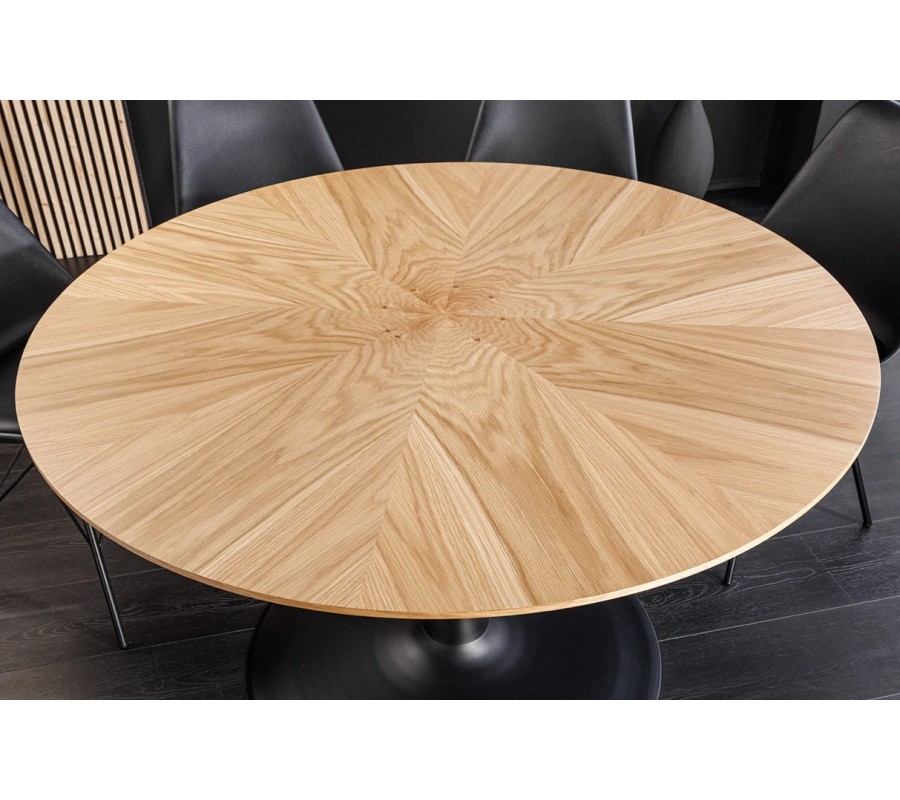 Designový moderní kulatý jídelní stůl Maderia s dubovou světlou hnědou deskou a černou kovovou nohou 120 cm