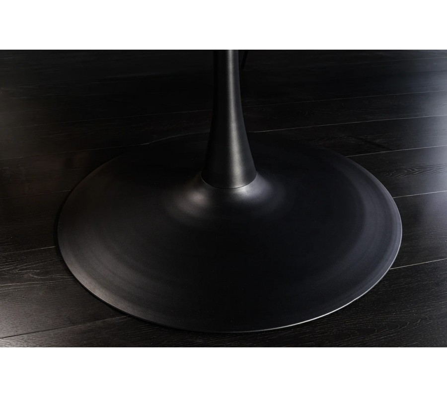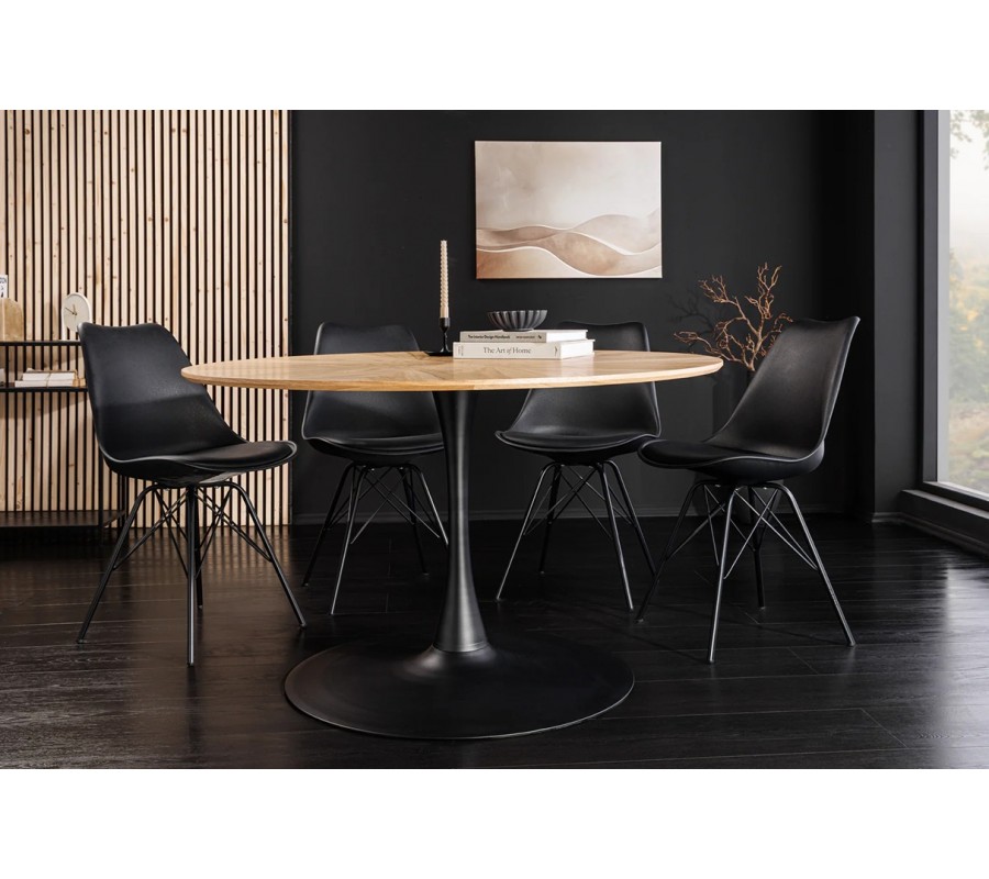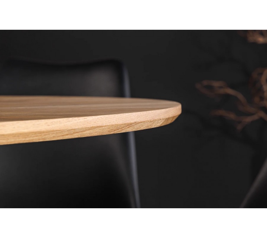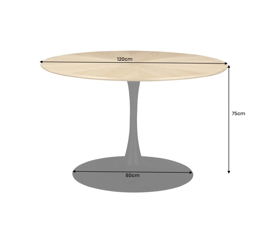 Jídelní stůl Maderia vás okouzlí svým minimalistickým moderním designem, který naplno využívá estetický potenciál dřeva. Černý kov přináší nádech industriálního stylu a deska o průměru 120 cm poskytne místo k sezení pro čtyři osoby.