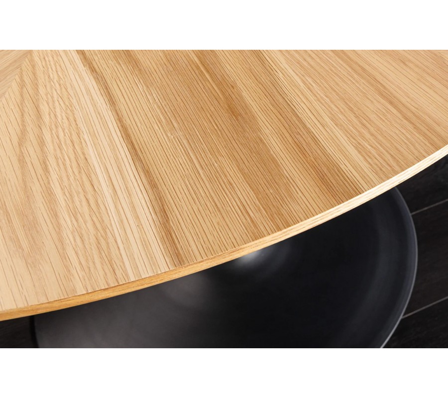 Vrchní deska je vyrobena z dubové dýhy v naturální světle hnědé barvě. Design originálně využívá estetickou kresbu letokruhů dřeva, jejíž linie paprskovitě vycházejí ze středu desky a připomínají vzor hvězdy. Kovová podstava v matném černém provedení působí minimalisticky a nechává naplno vyniknout dekorativní charakter vrchní části.