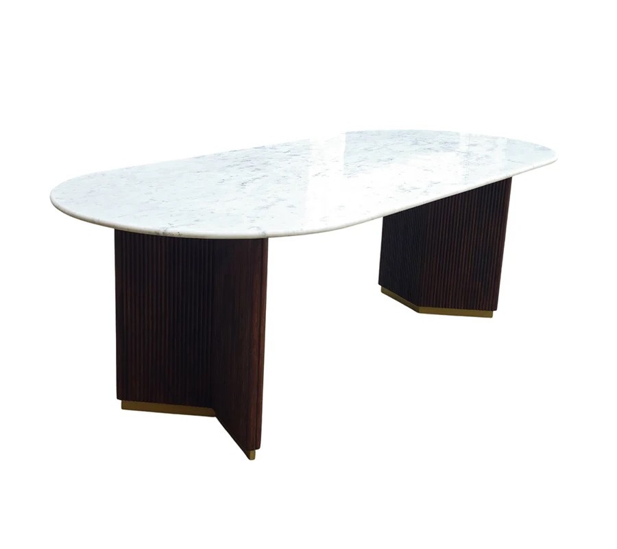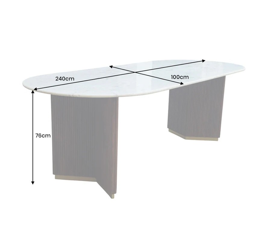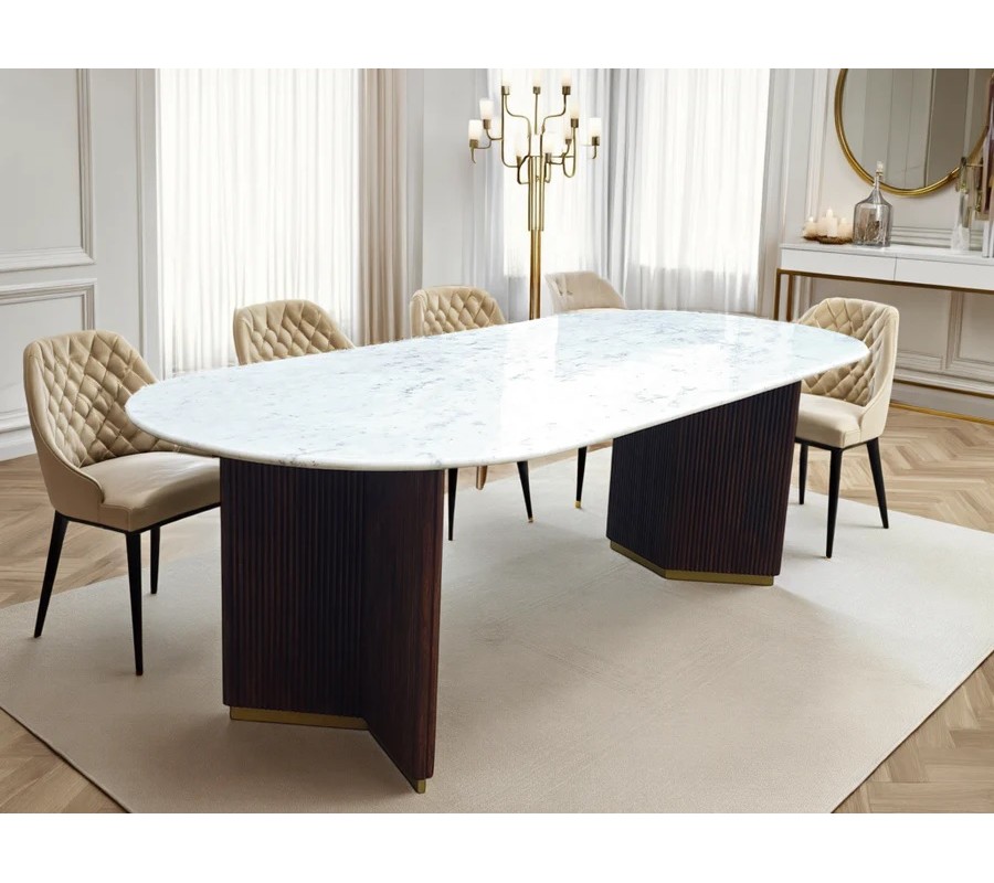 Art deco oválný jídelní stůl Gatsby s bílou mramorovou vrchní deskou a dřevěnými nožičkami 240 cm