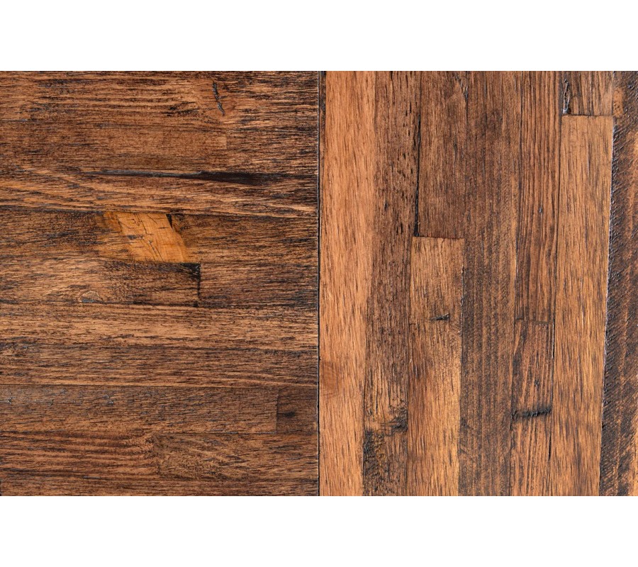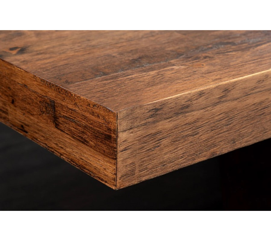 Jídelní stůl je vyroben z kombinace masivního a dýhovaného dřeva v naturálním hnědém provedení. Povrchová úprava s tmavou patinou ve vintage stylu zdůrazňuje strukturu dřeva a dodává mu rustikální výraz,