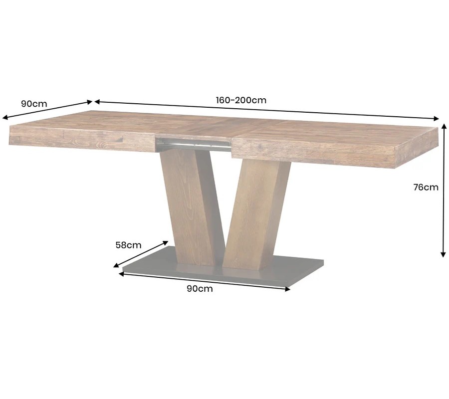 Stůl má obdélníkovou vrchní desku o délce 160 cm, která je předělena na dvě poloviny. Poskytne sezení pro čtyři až šest osob. Po odtažení dvou stran se uprostřed vysune panel a prodlouží stůl na 200 cm, s kapacitou šest až osm osob. Vrchní deska má obdélníkový tvar mechanismem.