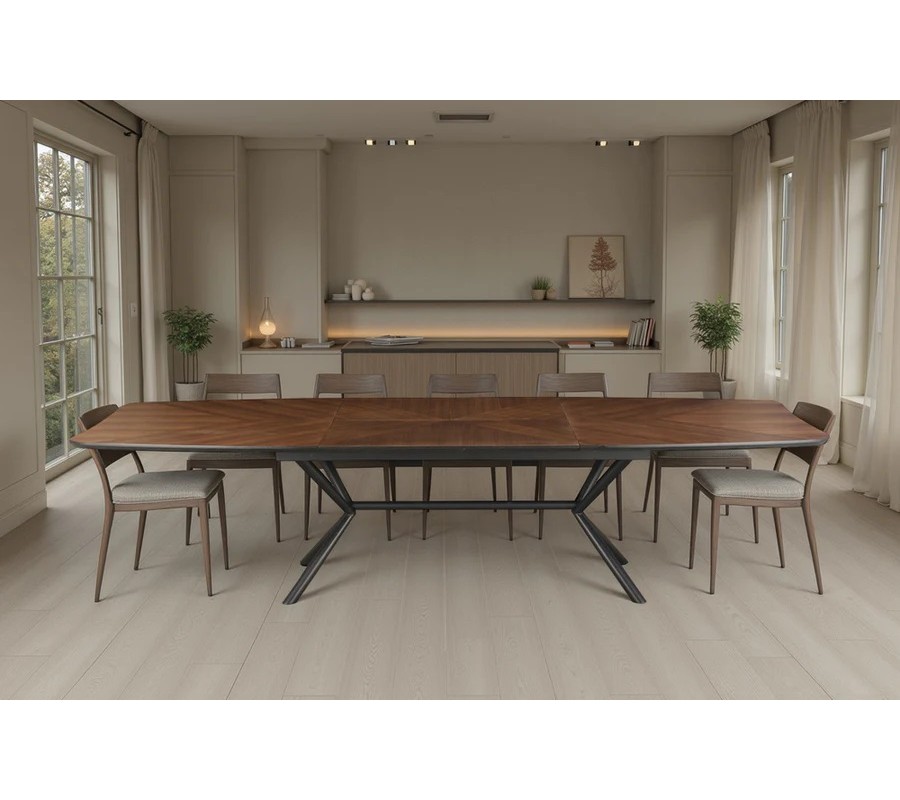 Jídelní stůl Arkline bude stylovým designovým středem vaší domácnosti. Spojuje prvky art deco stylu s nádechem industriální estetiky v moderním provedení. Oceníte také praktickou rozkládací funkci.